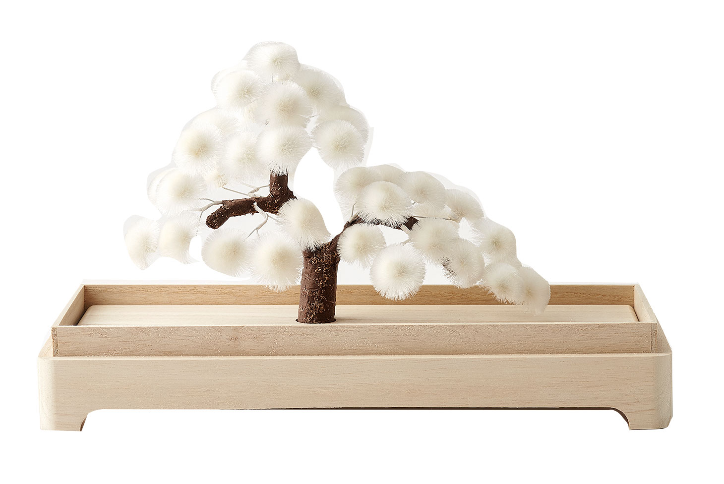 An indoor ornament that highlights “Matsu” (pine), traditionally a supporting element in Takasago dolls, reimagined as the main feature. Using colors and paulownia boxes never before seen in the world of traditional dolls, it expresses a new sense of beauty. The auspicious world created through traditional doll-making flower techniques, unlike ordinary faux greenery, blends with the globally admired world of bonsai. It allows you to enjoy the world of bonsai indoors with ease, without the need for daily maintenance. The lightweight paulownia box is ideal for storage and meets the needs of international customers as well.