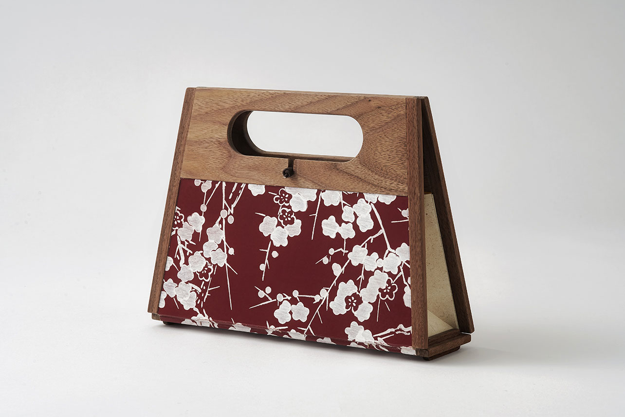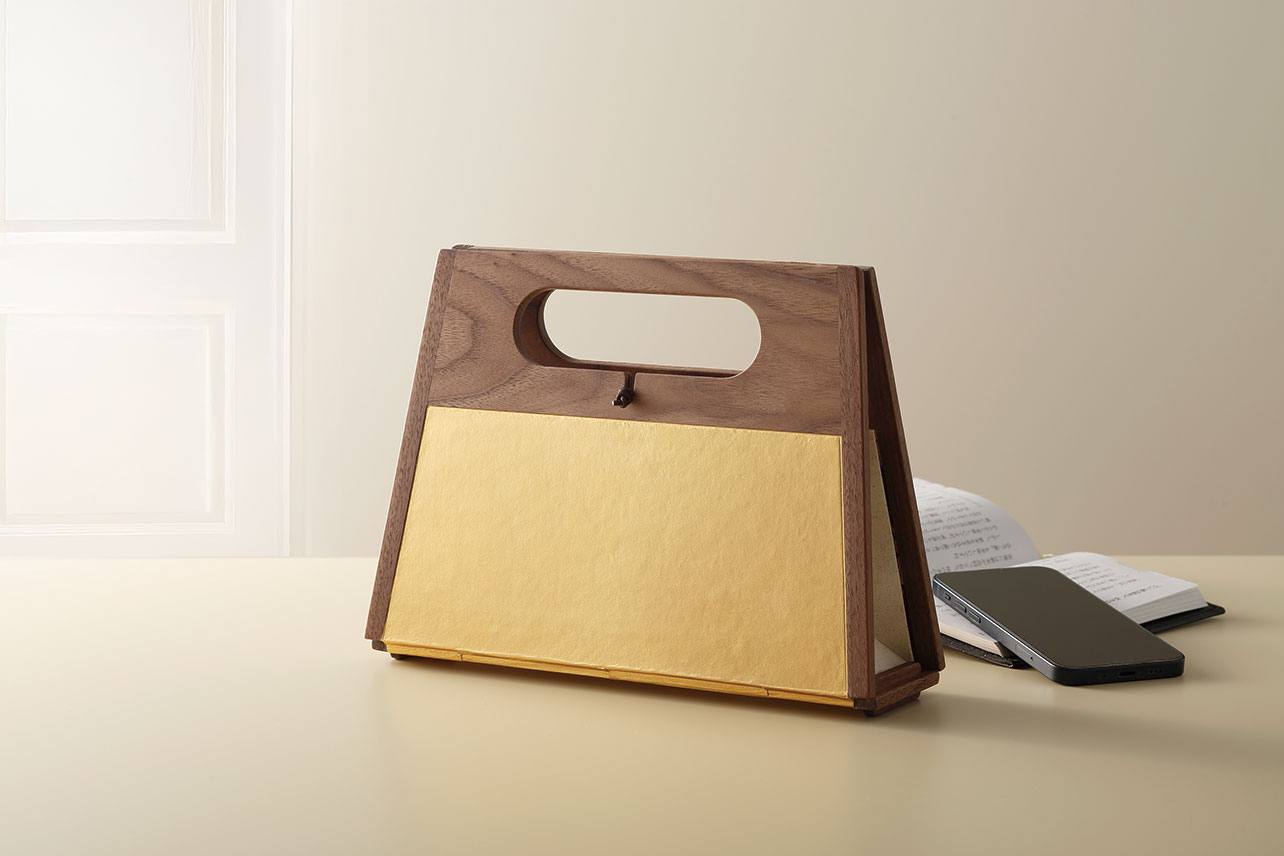 A unique mini bag crafted from washi paper and wood using Edo Hyogu techniques, assembled simply by “sticking and folding” without stitching. The wooden frame, made from Edo karakami and natural wood typically used for fusuma and byobu, features a warm and simple yet refined design that complements both Japanese and Western attire. The design also focuses on usability, with a removable inner pouch that stays securely in place during use and leather cord fastenings for effortless opening and closing.