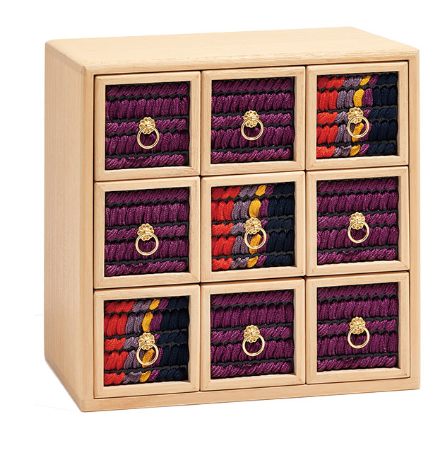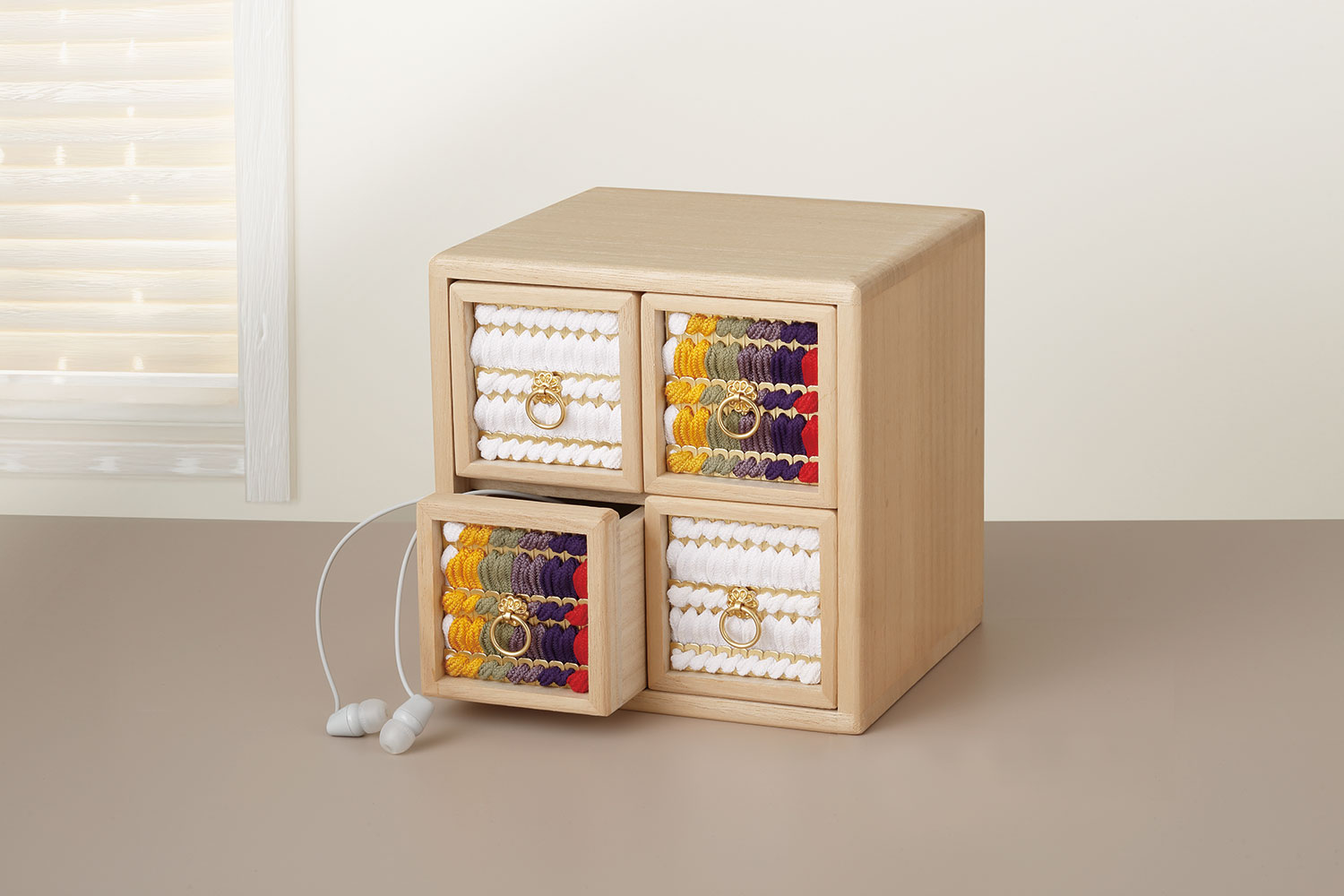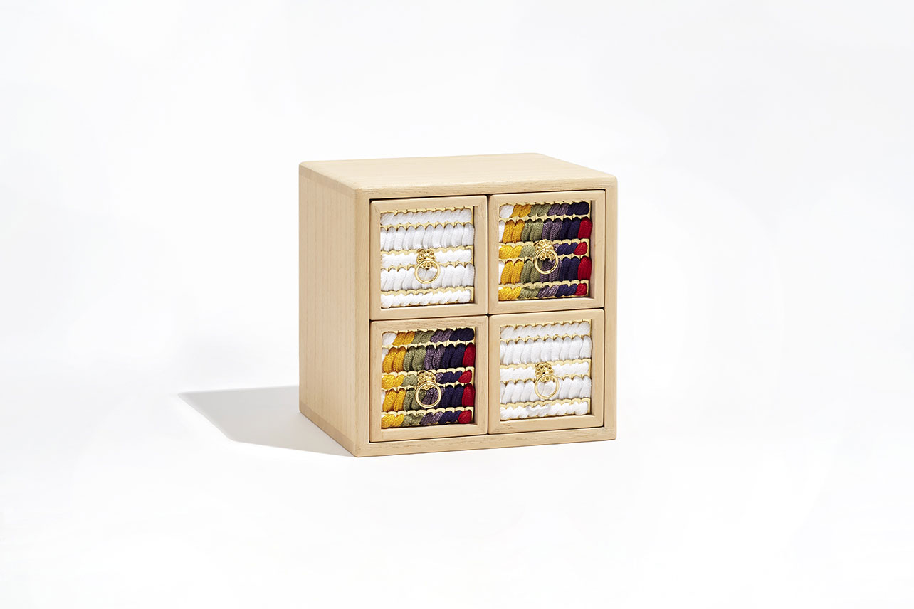 We have reimagined the decorative style known as “Odoshi,” seen in the Katchu (samurai armor) of the Heian and Kamakura periods, in a contemporary design embodying the warrior’s aesthetic. The knob features a “Kikuza,” a fitting traditionally used in armor. It combines the elegance of a crafted artifact with the aesthetic appeal of an interior piece and practicality for everyday use, realized through the artisan’s mastery. The vibrant color scheme of the braided cords on the drawer front embodies auspicious wishes, symbolizing concepts like “harmony” and “family unity.”