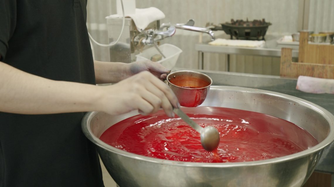 There are no specific recipes for formulating the colors. The craftsmen adjust the contents while cross-referencing them against samples in accordance with various elements, from the weather on that day through to their own physical condition, and then decide on how long the kumihimo cords should be submerged in the dye.