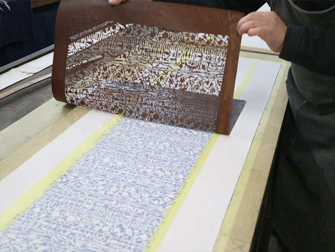 The layered colours, and special beauty of a peacock's wing. The work of dye master of Yoshikazu Fujimoto has the depth and iridescent colour of such a bird. Fujimoto practices a technique known as 'tezashi' stencil dye, where he uses a small brush to paint between the gaps of a stencil glued to fabric. Among stencils he selects of combination of two, or three, to create original patters. The strange effects of this combination, together with Fujimoto's own 'blur dyeing' style of colour gradation, are part of the secret to create the peacock wing beauty of his work. The owner of a unique style, Fujimoto acquired it through his more than 60 years of experience in the dye trade. He was born in the textiles region of Hachioji in Tokyo, into a family of weavers. After graduating college in 1954 he entered the tutorage of Sonbei Ishii, a master of the Edo Komon print technique. After more than a decade spent perfecting his skill with Ishii, he struck out alone, and established his own workshop in Hachioji. In addition to his stencil dye work, Fujimoto is also a master of the 'woodblock dye' style, which is rare even in Japan. An innovator still today, Fujimoto says that he loves a challenge. Recently he has branched out from kimono to new canvases: such as parasols, to find new expressions for his work.