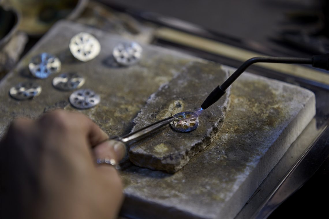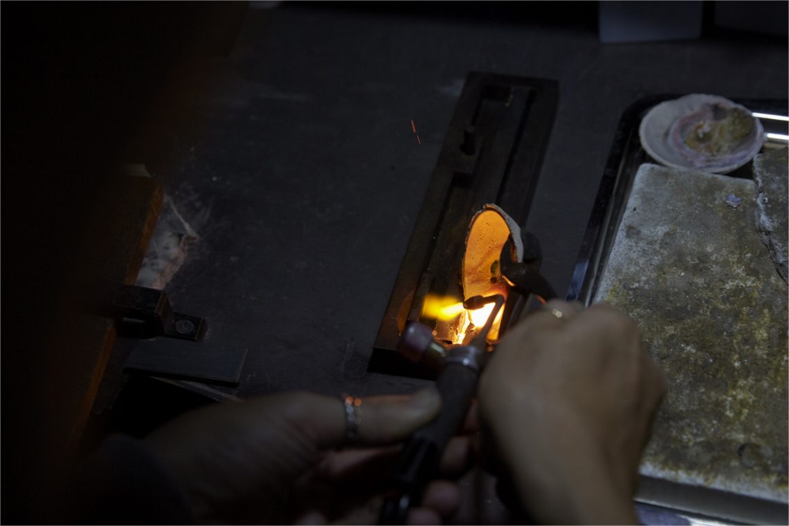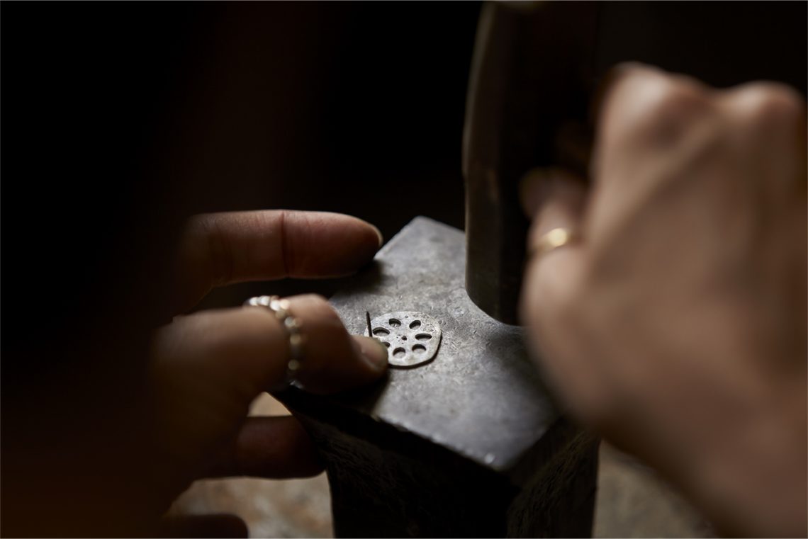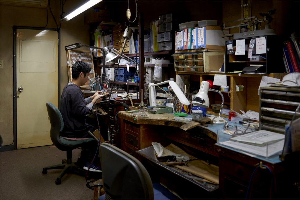 When you look at Tatsumi Geishas (Geishas of the Fukagawa Area of Edo (modern day Tokyo) in the Edo Period (1603 - 1868)), you see the 'chic' of Edo. Their demeanour and attire, together with their policy of 'heart and vigour', was the reason they were adored by men and women. The roots of jewelry reform & shop SASHOU are in crafting the ornaments these Tatsumi Geishas were wearing. The grandfather of the craftsman in the third generation, Shinichi Sashou, crafted hairpins and obidome (knuckles for obi belts) in accordance with the wishes of the Tatsumi Geishas. When Mr Sashou was still a child, there was a fuigo (bellows) in the workshop, and next to it, he says, there was a birdcage. His grandfather used the fuigo to kindle the fire and melt bullions, casting, hammering and engraving them, crafting lustrous ornaments. Apparently the bird in the birdcage was kept because with its twittering it signalled the change in air during the casting process. The times changed, and nowadays there is neither a fuigo, nor a bird cage in the workshop. Though, the steps of casting, hammering and engraving by hand in the workshop did not change. Trusting in their techniques, requests come from all over the country. A lot of them are requests to reform keepsakes and relics. Mr Sashou sincerely processes each single request, filling the ornaments with life once again.