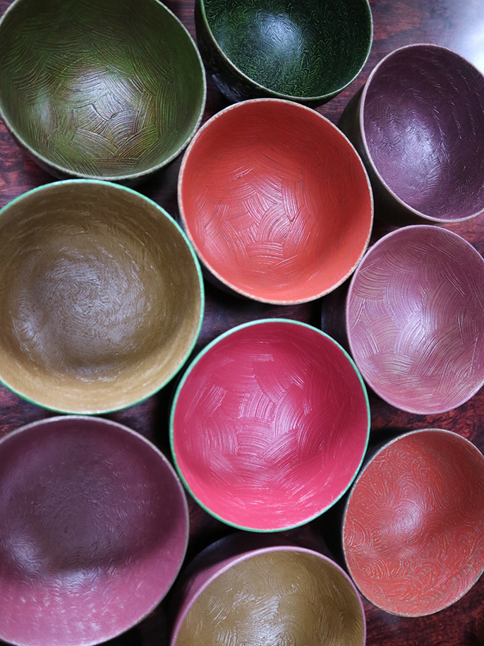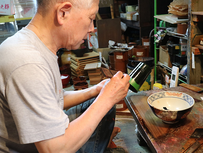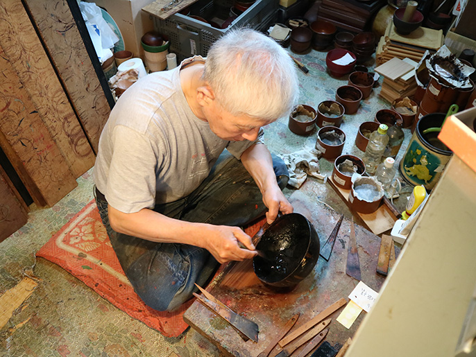 The lacquer style known as Edo Lacquerware is one fit for tough environments. For use in takeaway sushi, or soba noodle shops. At restaurants it is touched by many hands, in kitchens it is washed again and again. To survive these circumstances Edo Lacquerware has many coats of its material applied at its base. Mitsuo Kaku of the Kaku lacquer works had his first encounter with Edo Lacquerware aged 16. His sister had married into the family of the Kato lacquer works in a downtown district of Tokyo. Visiting from his native Fukui at the end of one year to help out at the works, Kaku's first impression was the smell. The distinctive aroma of lacquer imprinted itself on his memory. Now wanting to work in the trade, he persuaded his parents, and moved to Tokyo for good aged 19. From here he began to live at the Kato workshop, and train full time. Within the daily business of the works, there included commissions in repair and other new tasks. His knowledge of lacquer increased, as did his understanding of the customer's needs. After leaving to establish his own workshop, this appreciation of customer demands led him to focus on making "something there is only one of in the world". In Kaku's workshop lacquer in different colours spreads out like a flowerbed. With the numerous tools at his disposal, this lacquer transforms according to styles such as Negoro and Tsugaru-nuri. With each pattern unique, the items that Kaku makes are adapted to "you, the customer".