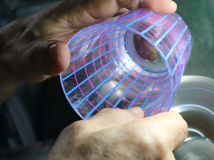 When the pattern Kikutsunagi (Chrysanthemum chain) is complete in cut glass across an entire piece, the result is known as Sougiriko. Straight lines need to be cut again and again across the glass surface, and if they do not cross in the correct locations, then Sougiriko will not be achieved. It is a technique to test the skill of the craftsperson. The Kobayashi Glass workshop was one of the first to achieve Sougiriko, and to describe the main characteristic of this work is to describe exquisite detail. The skill of Edo Kiriko cut glass was initially cultivated in the state-run Shinagawa Glassworks in the Meiji period (1868-1912). Here the British glass engineer Emmanuel Hauptmann was employed to instruct students who included Tokumatsu Ohashi. Ohashi in turn acted as mentor to Kikuichiro Kobayashi, the founder of Kobayashi Glass. One characteristic of the method used in the Kobayashi studio is an additional process in making cut glass. Whereas it is typical to mark guidelines onto the glass, and move to first main cuts, the Kobayashi craftsmen engrave lines onto the glass prior to cutting with a "sujibori" technique. With this process which began with the company's second generation, they believe they can achieve even more precise results. The exquisite detail in the studio's work began with its first generation: Kikuichiro, and its techniques were passed to Hideo, Yoshiro and now to the forth generation: Kohei Kobayashi.