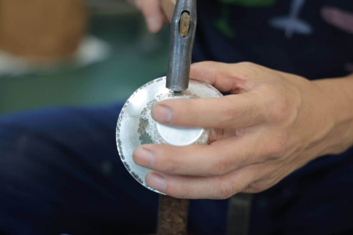 The basic process begins with melting the silver, which is then formed into sheets and thinned using a press machine. The thin silver sheets are then hammered to shape. While they take the time to create individual products, their ability to use press machines for mass production allows them to meet a wide variety of needs. This versatility and high level of skill are among their strengths.