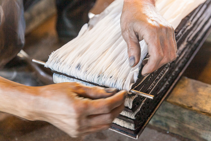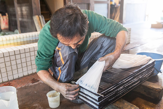 Ward Indigo of Europe, Indian Indigo of India. There are different indigos around the world. Japan Blue might be the name given to the prized, deep colour achieved by the leaves of tadeai indigo. The fermented leaves of this plant create the 'sukumo' which is main element for dyeing. The main production region for these leaves is in Tokushima in west Japan. There not many specialists involved in growing the plant, with only 700 bales produced per year weighing 50kg each. Within this limited production, 50 of the bales are supplied annually to the Kosoen 'Aizome' (indigo dye) works. Kosoen can be found in a mountain hamlet in the outer western Tokyo region of Ome. In its storerooms wait fermenting 'sukumo' resting with lye, sake, bran, and lime. Eventually, a foam known as 'indigo flowers' will appear on the surface of the liquid, indicated that the time for dyeing has arrived. This normally takes around two weeks. The process needed to make this liquid for dyeing is called the natural indigo fermentation method, and it is practiced by very workshops. Kosoen was established in 1919, and now in its third generation, is led by Hiroshi Murata. He began his work in natural dyeing in the first year of the Heisei era (1989), and says 'I believe that this kind of craftsmanship will once again have its day.' This hope, and his belief in the quality of his work, is what drives Murata to seek to increase the fans of 'Japan blue' both at home and overseas. The Edo era centre of excellence in handmade indigo dye, Ome is once again receiving the attention it deserves.
