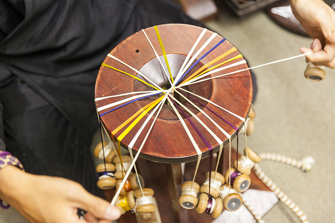 The silk thread dyed in the color of the wild flower is crossed to the right with the hands of craftsmen and assembled. In the Ryukobo, the tools that make up the silk codes are generally called "Kumidai", but they also have "Marudai(Round shaped)", "Ayatake Dai", "Kakudai (Square shaped )", "Koudai "and choose the right Kumidai by the silk code patterns .