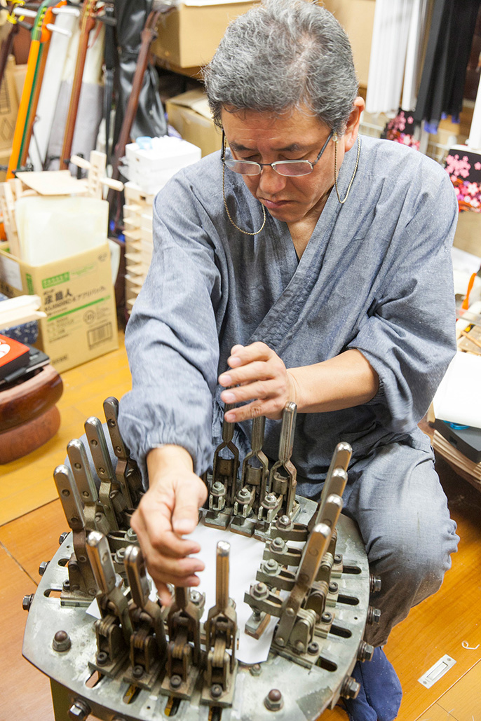 Perhaps because he is not steeped in the multi-generational traditions of a shamisen making family, he is able to bring new approaches and ideas to the business. He has for example, tried to move from using stretched animal skin to alternatives for the main body of the shaminisen. He has also developed new tools (kisen) to hold the stretched skin in place. The productivity improvements, and the professional quality sound created as a result of these changes, has led to them slowly becoming standard.