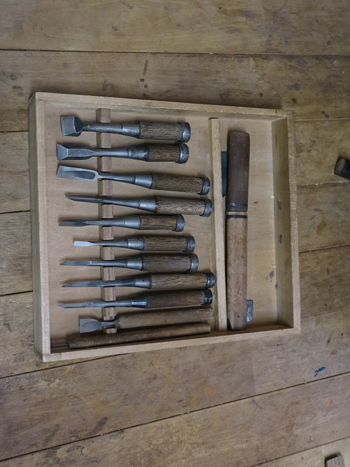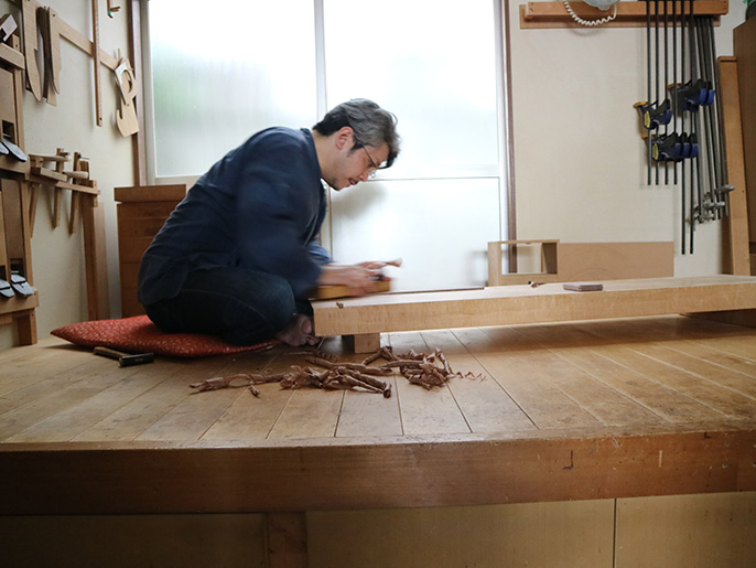 Without use of a single nail, the sashimono joinery technique creates furniture and items for daily life. Measured precisely and exquisite in its finish, sashimono is strongly built, with clear lines. However, should it need repair, a few hits from the joiner's hammer can break apart the construction. A deep knowledge of wood, and an ability to activate its qualities are what allow sashimono joiners to achieve these effects. The lead craftsman of Sashimono Masuda, Daisuke Masuda, in a previous job at a furniture makers one day happened across the technique, and was struck instantly. A furniture drawer that the moment before closing appears sucked into the wood. The distance the matter of a few microns, this work is completed not by precision machinery, but by craft. Impressed in this encounter, Masuda was inspired to knock on the door of a famous craftsman in Edo sashimono. After completing an apprenticeship, Masuda went on to establish his own workshop, where he makes his own range of make-up dressers, wardrobes, full length mirrors, tools for tea and much more. Many of these items are used in kabuki or other aspects of Japanese traditional arts. Nevertheless, Masuda is keen to spread the appeal of sashimono beyond this world alone. To make items to bring sashimono into contemporary life, and in so doing to offer others the chance to have a moment of encounter similar to his own. It is with this in mind that he approaches work in his craft.