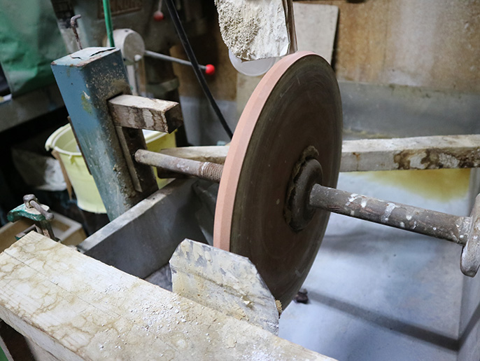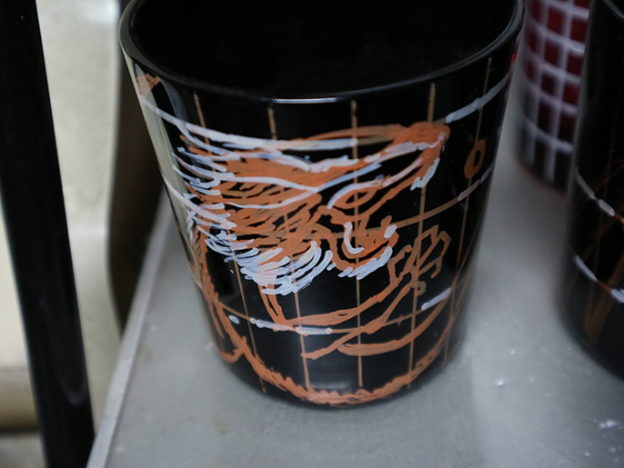 It is a style that opens a new world in Edo Kiriko cut glass. The work of Hideyoshi Tadano - the second generation leader of the Tadano glass works - is distinctive in itself. Its motifs are drawn from animals and landscapes: winter trees, gold fish, skulls and spiders. Using different diamond wheels such forms are cut into the glass. While the work recalls the reliefs of René Lalique, the use of red and lapis lazuli colour glass sections with cuts around, allow them to exceed Lalique in the rich world that they create. In the case of an Edo Kiriko design that features a goldfish, the red glass left on the tail and the cuts that surround it give the impression of movement in water. Hideyoshi Tadano worked in an architectural design firm before coming to Edo Kiriko cut glass. He then spent just two and a half years working together with his father, Koichi, the founded of the Tadano works. He is almost self-taught in the skills he has developed in glass. A tough and lonely road to success, it was perhaps this period of introspection that inspired his unique approach. The diamond wheel left by his father first among them, the tools in the workshop support his work.