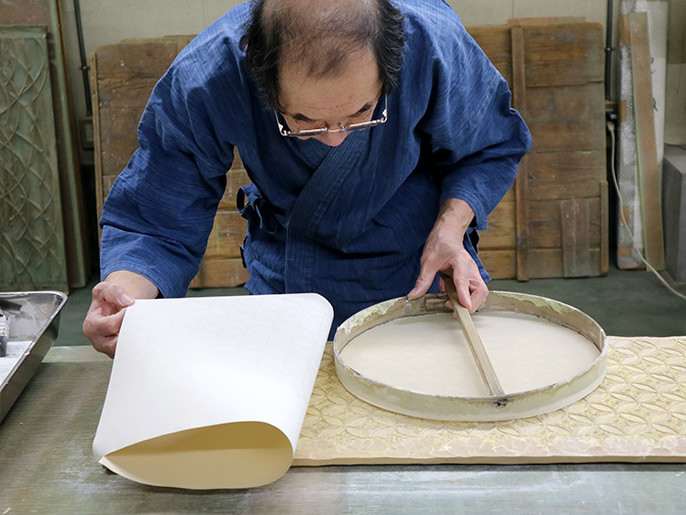 There is a rare place in Tokyo's Ueno district to find and enjoy traditional 'Edo Karakami' paper. This is the showroom and shop of Tokyo Matsuya. On the second floor can be found sample fusuma sliding doors and byobu room screens, while on the floor below are small writing pads, and envelopes for gifts - all making use of the karakami paper. Tokyo Matsuya was founded in 1690 by Ihei Matsuya as a dealer in kusazoshi woodblock printed literature and other forms of early publishing. Subsequently at the end of the Edo era and into the Meiji period (in the late 19th century), the business began to specialise in paper products for the home such as fusuma paper, paper for shoji partitions, material for hanging scrolls, and in various types of hardware of the day. For Edo karakami printed paper, the chaos and collapsed demand of the war years and aftermath, led Tokyo Matsuya to abandon the trade. That was until the current leader of the business Rihee Ban, decided in 1992 to revive this area of work. Three hundred years since Tokyo Matsuya's inception, this was a project worthy of the anniversary. The result was a book of 393 paper and karakami samples, entitled Irodori. From here on, working with craftspeople who maintain the difficult skills needed to print Edo karakami, Tokyo Matsuya has acted a distributor and publisher for the traditional paper, with the capacity to produce beautifully to order.