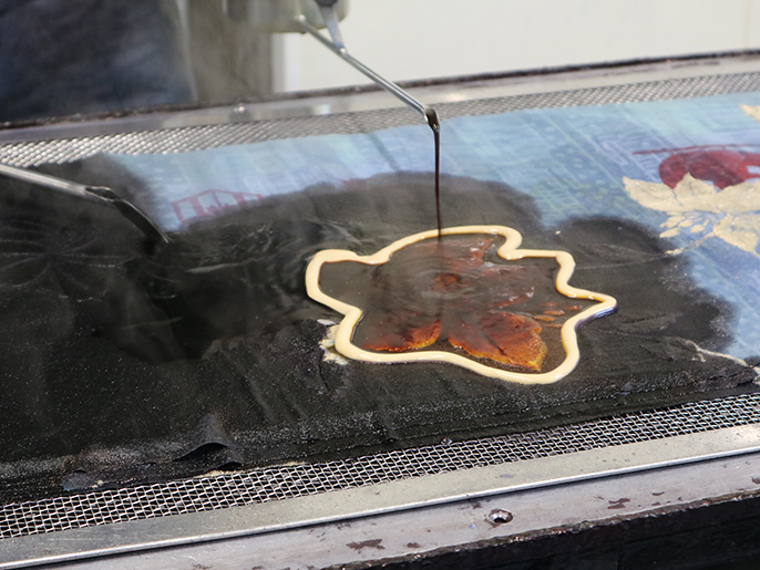 The "Chusen" dyeing technique was invented in the Meiji era, which means as literally shows "Pouring pigment" from kettle to the fabric. Before Chusen was invented, the mainstream of Tenugui making was