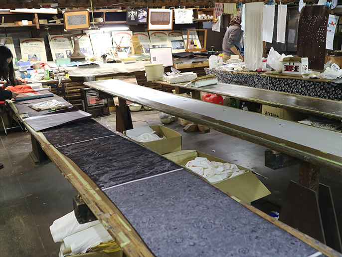 The Edo Komon pattern is said to have begun as a printed pattern for the kamishimo official wear of the samurai. Viewed from a distance the pattern seems almost a single colour, while close up the dense and detailed work is revealed. The samurai competed to have ever more close and intricate patterning, and this gave birth to designs such as Gokusame ('dense shark pattern'), and Kikibishi ('chrysanthemum water chestnut') and many others. By the mid Edo period, the wider population beyond just the samurai class, were able to afford to wear patterned fabrics, with natural scene motifs made with stencils a popular look. The Tomita dye works was established in 1914, as a workshop specialising in Edo Komon and Edo Sarasa among other patterns. The workshop in the area of the Shinjuku-ward given over to dye-works, is atmospheric with the accoutrements of the trade in evidence such as the 'steam box' used to set colour onto fabrics. An historic workshop, the number of stored Ise-katagami paper stencils, reaches to around 120,000 when those used for Edo-Sarasa and Edo-Komon patterns are combined. Many of these feature modern designs. The fifth generation leader of the Tomita dye-works is Atsushi Tomita, who has advanced designs for sunshades and scarves and other items that meet contemporary needs, but retain the dyed Edo Komon and Edo Sarasa motifs. The Tomita works are even responsible for the production of the 'Furoshiki cloth' series of official goods for the Tokyo Olympic and Paralympic games in 2020. Beyond their origins in the kimono fashions of the past, the dye-works still today retain the spirit of the style-conscious samurai and Edo locals that first gave them life.