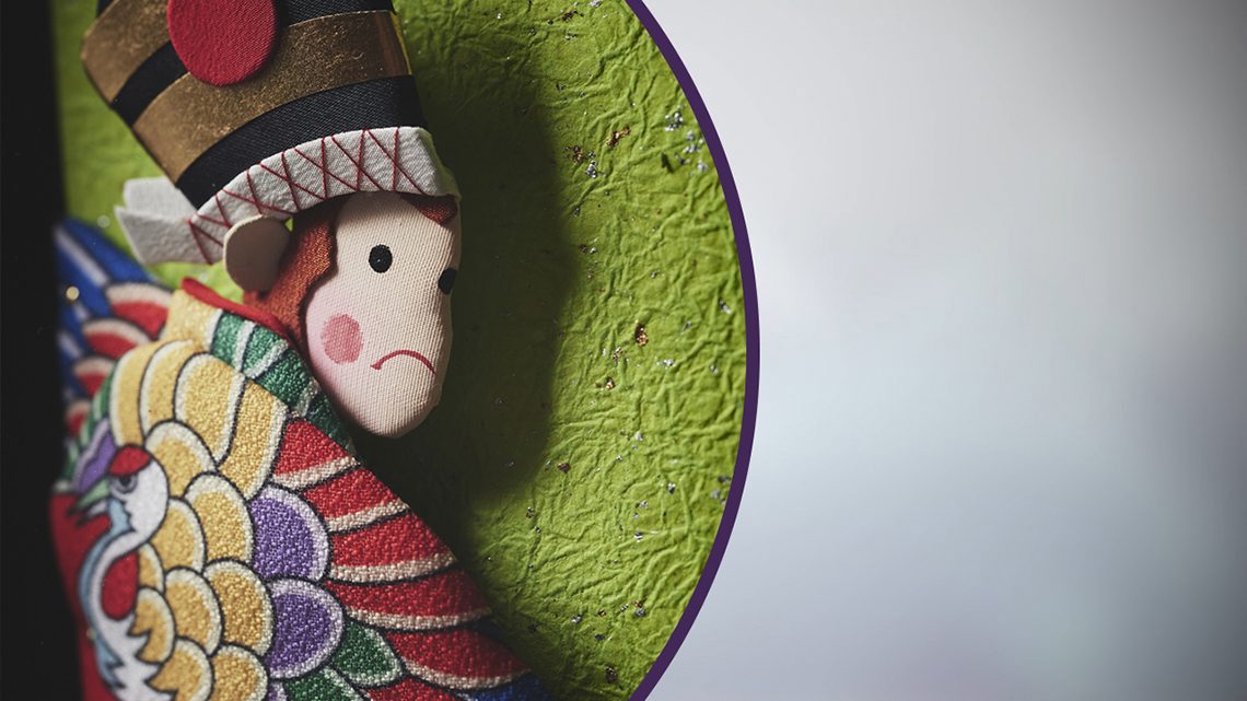 伝統的な江戸押絵羽子板の技法で作られた「額装縁起羽子板 三番叟」について動画で紹介します。
