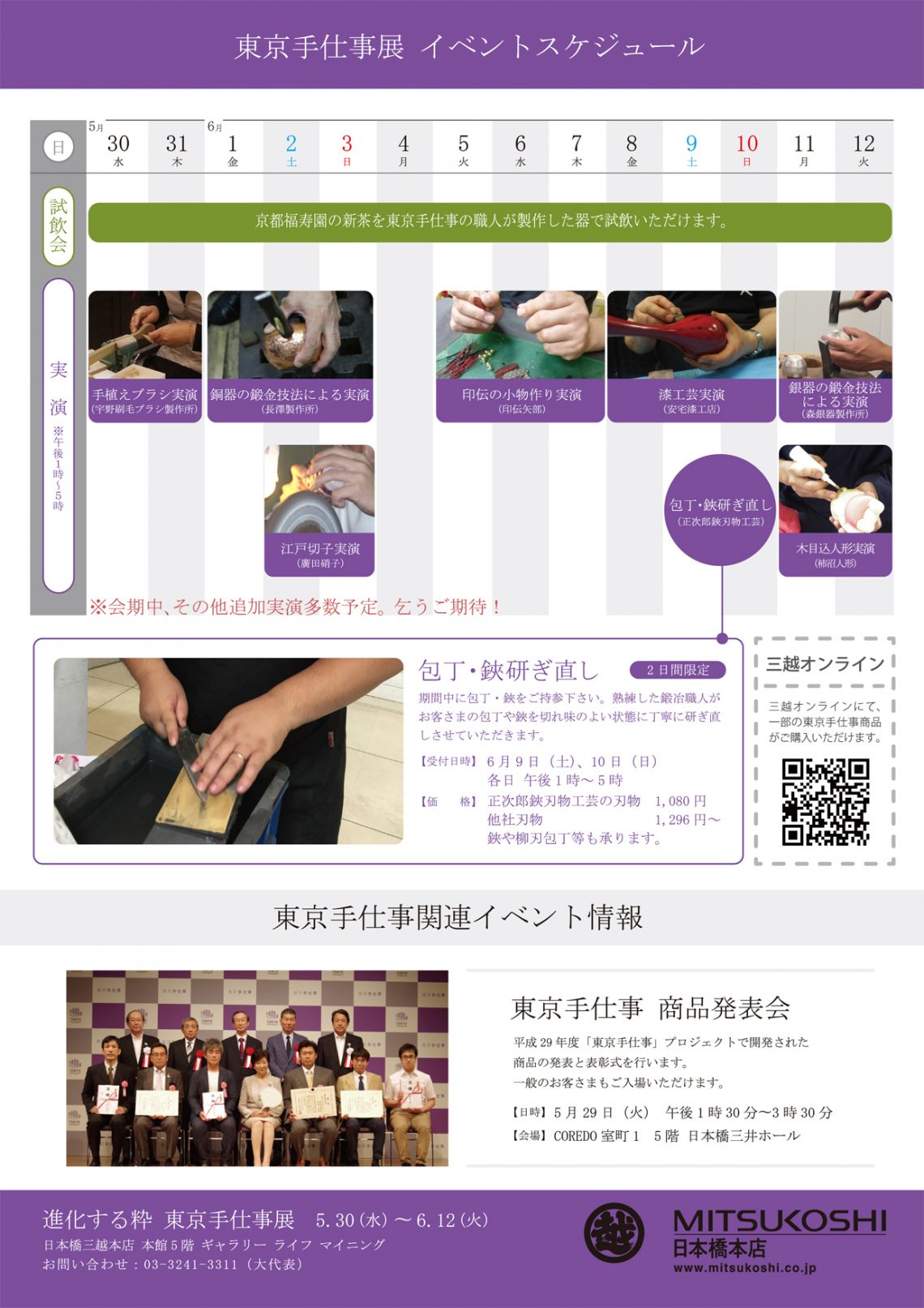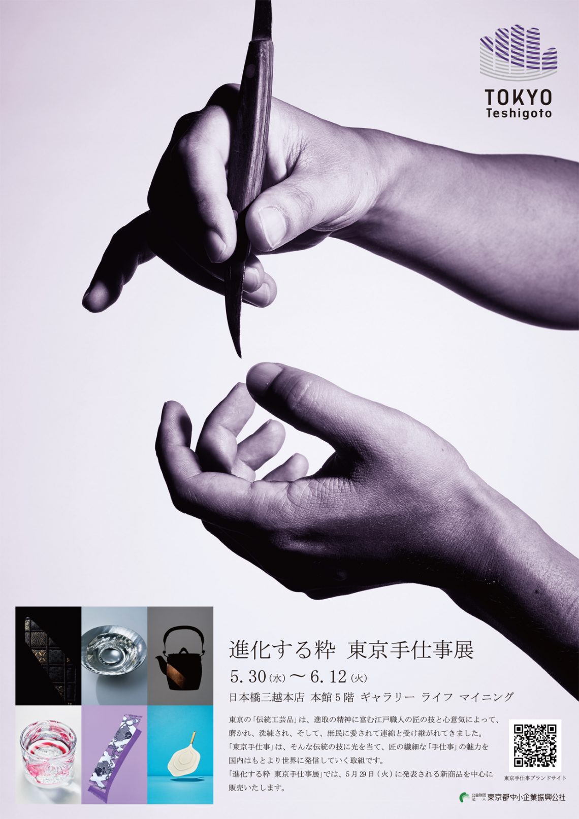 平成30年5月30日(水)から6月12日(火)まで、日本橋三越本店本館5階にて、東京の職人とデザイナーのコラボレーション商品を中心とした期間限定販売会「進化する粋 東京手仕事展」を開催いたします。会期中は、様々な職人による実演、京都福寿園の新茶を東京手仕事の職人が作製した器で試飲いただける試飲会などを実施予定ですので、是非お立ち寄りください。皆さまのお越しを心よりお待ちしております。