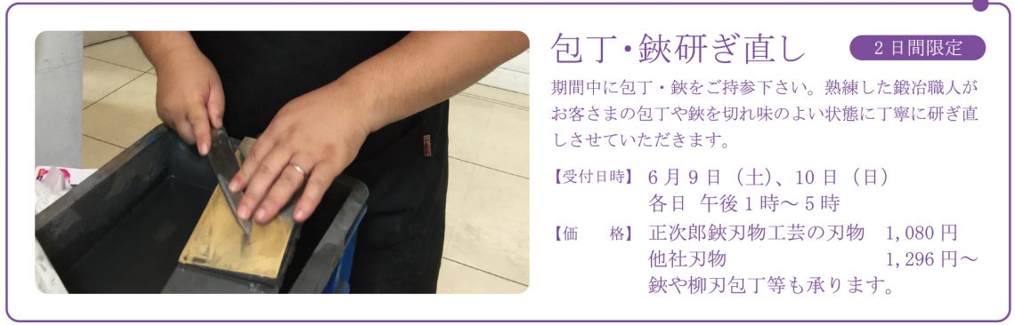 6月9日(土)、10日(日)の2日間限定で、包丁・鋏研ぎ直しを行います。期間中に包丁・鋏をご持参ください。熟練した鍛冶職人がお客さまの包丁・鋏を切れ味のよい状態に丁寧に研ぎ直しさせていただきます。
