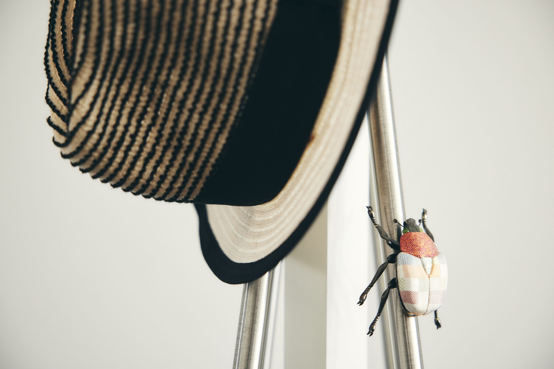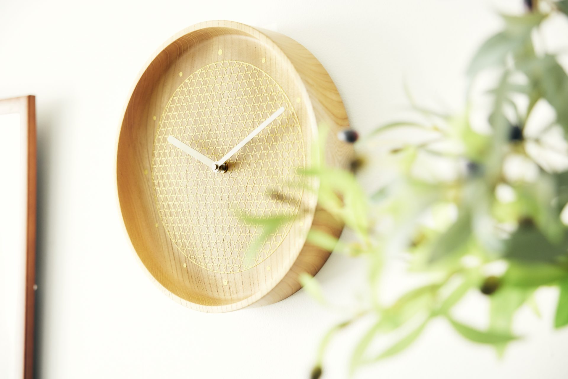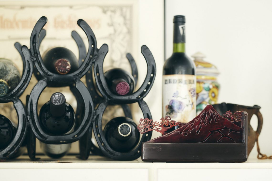 帽子掛けには木目込み人形の技術を駆使した昆虫のオブジェ「insectum(インセクタム)」がちょこんと止まり、壁には江戸小紋の伝統柄が文字盤に施された掛け時計「KOMON WOOD CLOCK」が。さらに、ワインラックの近くには、精巧な富士山の形をした漆塗りの置物「SHITTO-RI 漆雅」がさりげなく置かれています。