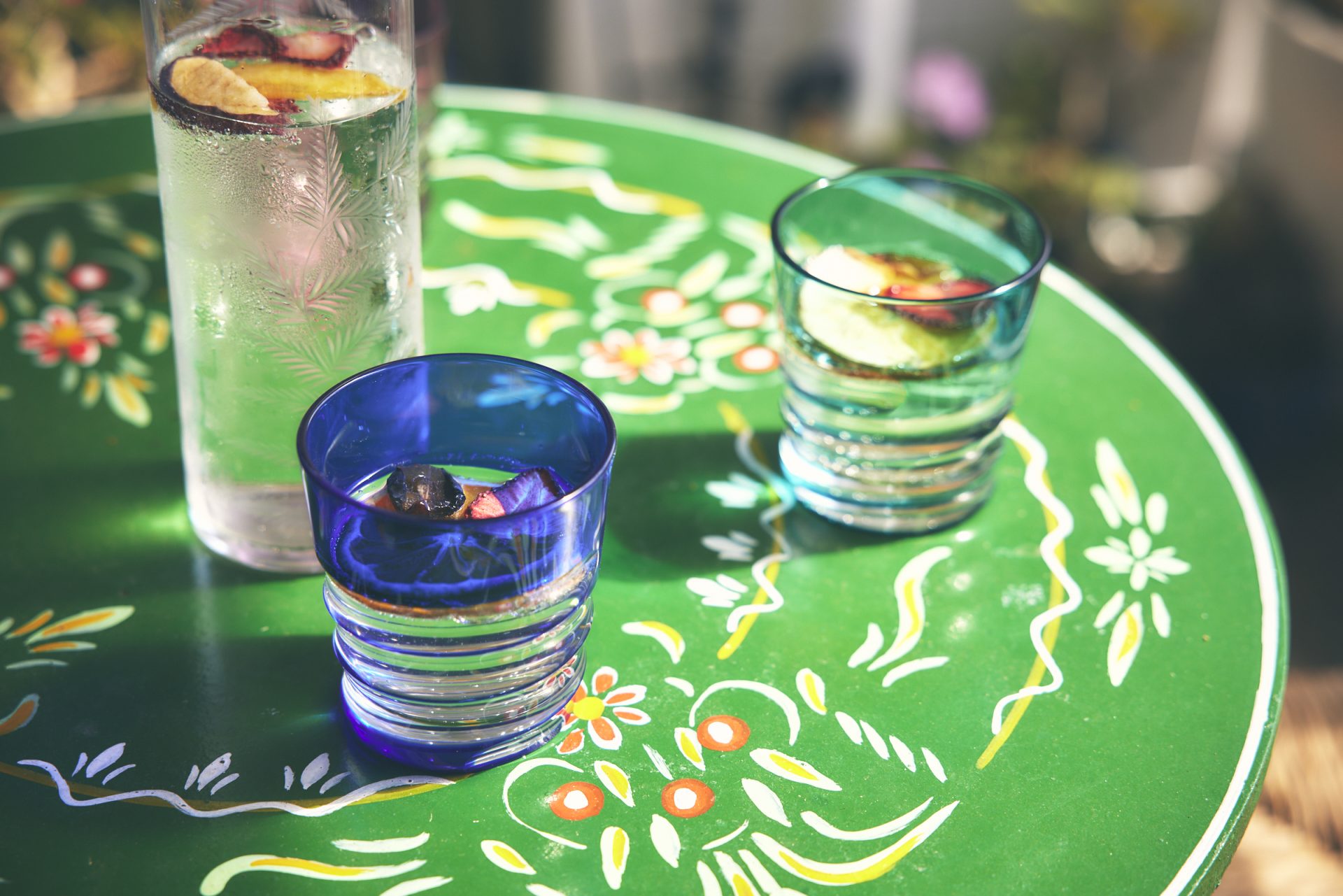 これらは江戸硝子や江戸切子なんだそう。美しい色で魅せてくれる一方、手に取るとどこかぬくもりのある造形がスペインの家庭料理にもよく合います。