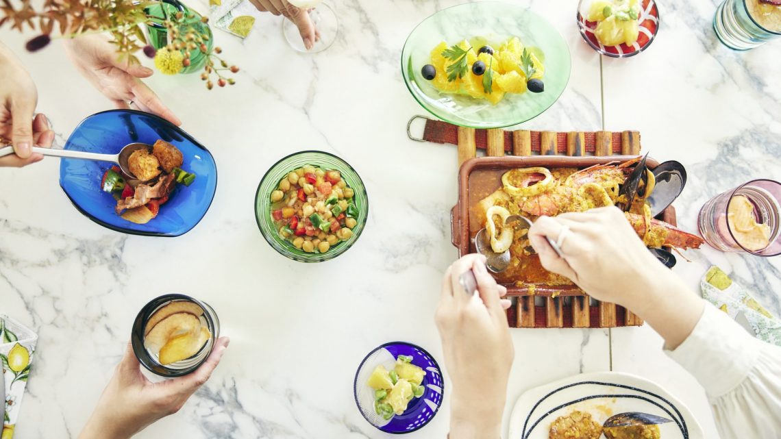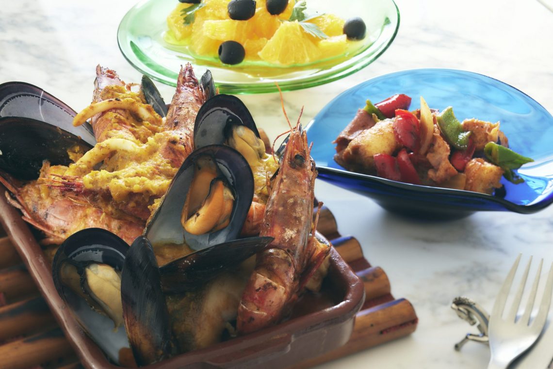 続いて前菜へ。アンダルシア地方でよく食べられるという「ひよこ豆のサラダ」やバレンシア地方の「オレンジのサラダ」、スペイン各地で広く親しまれているという「じゃがいものアリオリソース」が、赤や青、緑のカラフルなガラスの器に盛られています。