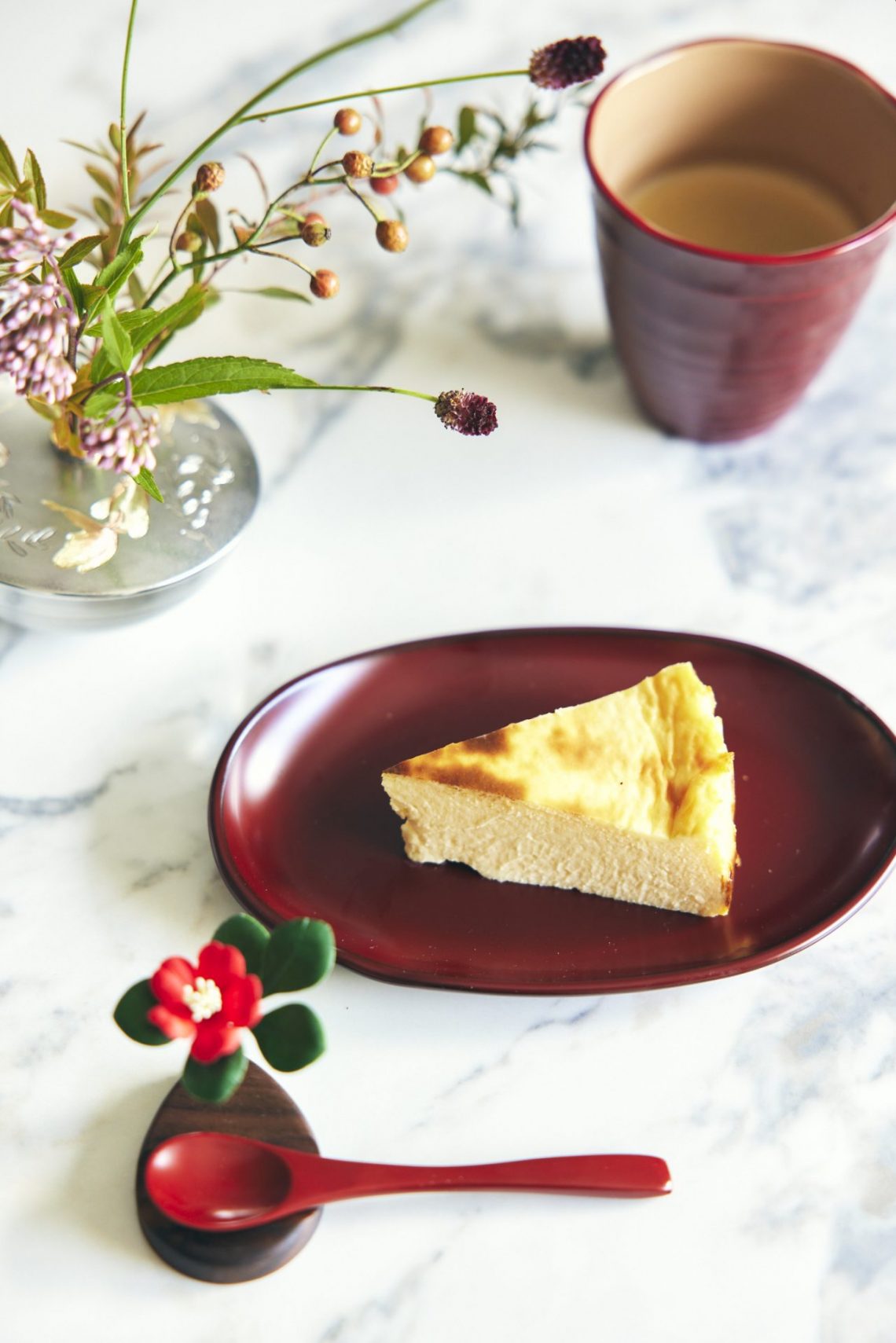 漆のカップとお皿に、スプーンは小さな椿の造花がついた「いちりん箸置き」に添えて、和モダンなティータイムとなりました。