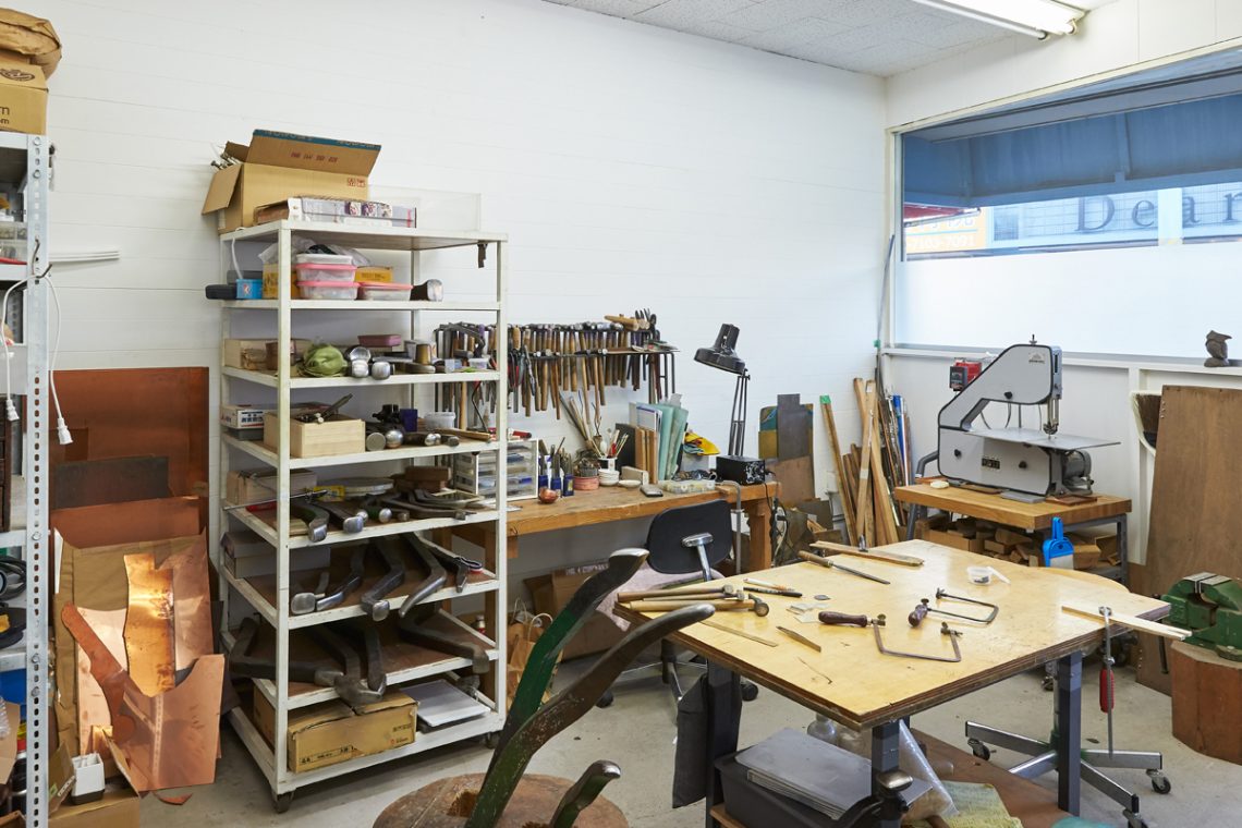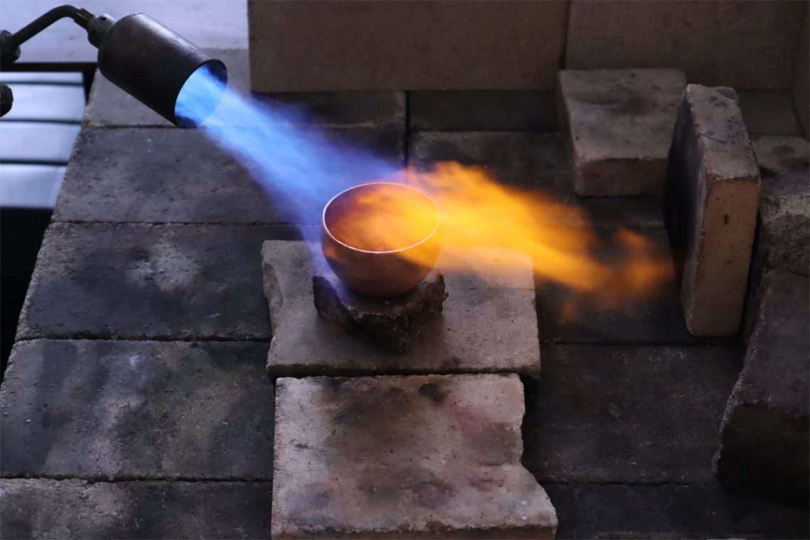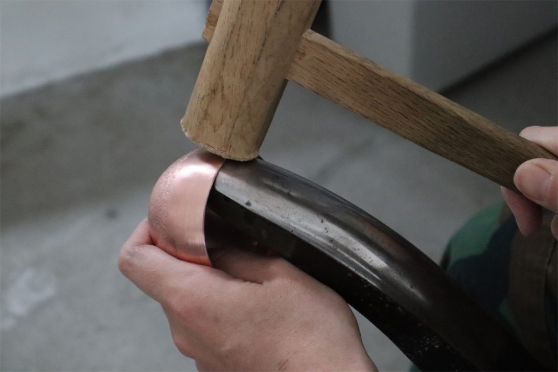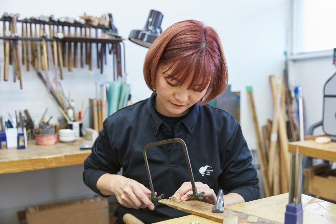 金属の板を、力強い鎚音を響かせて叩き形を変えていく。金鎚を握っているのは力強い作業とは無縁に見える華奢な女性、鍛金作家の宮田琴氏だ。祖父が鋳金作家、父も鍛金作家という家に育った宮田氏は、小さな頃から身近に金属工芸がある環境で育った。硬い金属の板が形を自在に変えていく面白さ、金属の持つ色やテクスチャーの美しさ。そんな金属の魅力に触れるうちに、ごく自然にこの道に進んだ。宮田氏の工房には、金鎚をはじめ金工の道具がずらり並ぶが、中には父から譲り受けたものもあるという。そんな道具を使い、宮田氏が銀、銅、真鍮などの金属から生み出すのは、小さいものはアクセサリー、大きなものは屋外空間を彩るオブジェ。いずれにも、柔らかなフォルムに女性作家ならではの優しさが宿っている。金属なのに温もりが伝わってくる。そんな作品が、生まれている。