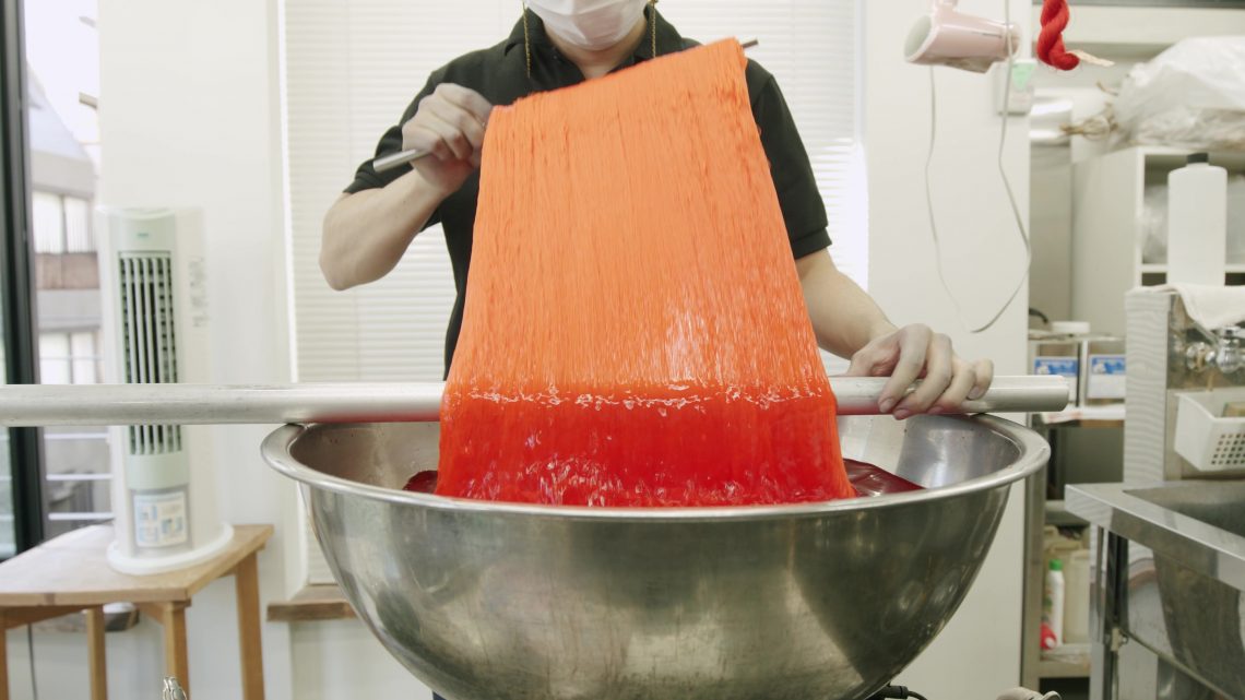 色を出すための、決まったレシピは存在しない。職人は、その日の天気から自身の体調に至るまでの様々な要素を加味して、色見本と照らし合わせながら染料を調合し、絹糸を泳がせる時間を判断する。
