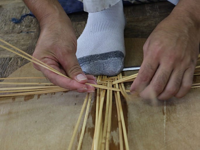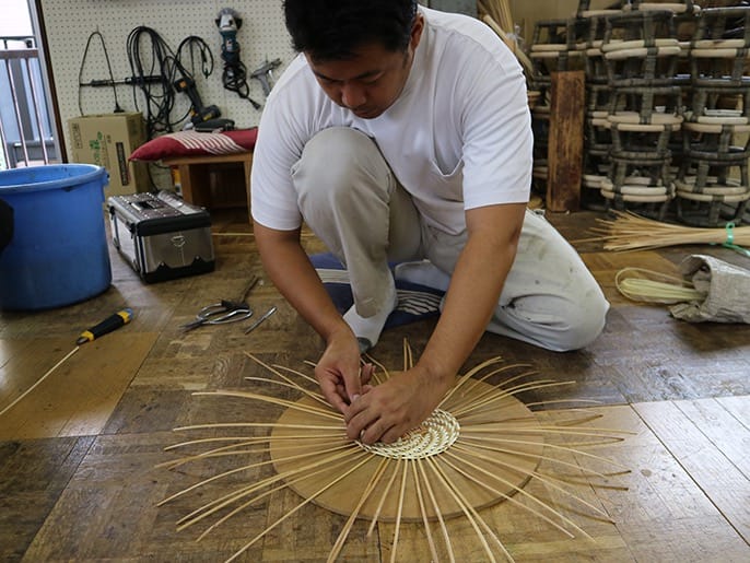 籐で編んだ敷物には、美と機能が備わっている。籐の表面にある"硝子質"が清潔感あふれる美をつくり出し、素足が触れるとさらりとして心地よい涼感が得られる。木内籐材工業が、この籐の敷物製作を始めたのは1931(昭和6)年。以来90年近く、籐をつかった敷物製作、家具製作に携わってきた。美しく、軽く丈夫な特性からプロユースとなることの多い籐製品だが、木内籐材工業の納入先には名門ゴルフ場、老舗旅館が名を連ねる。プロが信頼を寄せる理由は、確かな技術だけではない。原材料の買い付けまでを製作者自身の手で行う、こだわりにもある。インドネシアはボルネオ島。オランウータンが棲む鬱蒼とした熱帯雨林に、籐は自生する。原木は蔓状で、表面を無数のトゲが覆う野性味溢れる姿。ゴムなどの大木に絡みつく籐の善し悪しを見極めるのは、木内籐材工業・三代目の木内秀樹さん。父である二代目・友秀さんに代わり年三回、現地に一人出向く。インドネシア語も学び、通訳を通さずに交渉し良質な材料を調達している。プロの世界で定評のある敷物、家具だけでなく、籐のポテンシャルを引き出し、より広い層にその美と機能を伝える製品の開発にも余念が無い。
