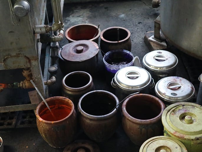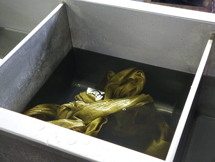 四十八茶百鼠(しじゅうはっちゃ・ひゃくねずみ)。江戸時代後期、幕府が出した奢侈禁止令(しゃしきんしれい)の下、庶民が身につけるものの色は、「茶色」「鼠色」「藍色」に限定される。しかし、そんな統制下でも洒落を競ったのが、江戸っ子。その心意気が、茶色、鼠色を多彩にし、"四十八茶百鼠"といわれるほどのバリエーションを生み出した。四季のある国に暮らす人々の"色"への感受性の豊かさもあっただろう。先の四十八茶百鼠を含め、日本の伝統色には、一千余りの色数があると言われる。1951(昭和26)年創業の近藤染工は、この多彩な日本の伝統色を自在に操る「東京無地染」の染色工房。染色機からは、もうもうと湯気が立ち上り、その前を色の見本帖を手にした二代目・近藤良治さんが、生地の染まり具合を確認しながら動き回る。見本帖の色にピタリと合う色は、赤、黄、青、緑、黒のたった5色の調合で作り出す。一千色を染め分けられる手は、まさに神の手。その神の手を頼り、白生地以外の素材を染めて欲しいというオーダーも増えてきた。その技術、経験でこれまで色を持たなかった素材にも色が与えられている。