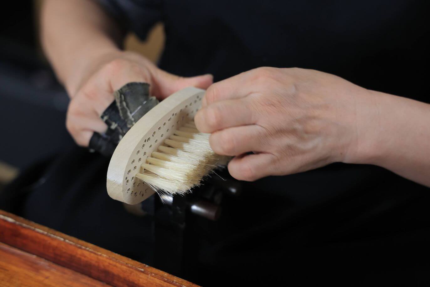 毛は抜けたりしないように根元にしっかり埋め込んでいくため、非常に力のいる仕事となる。