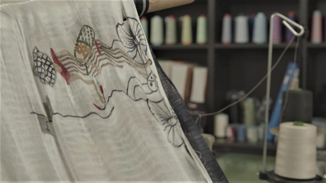 数センチに一本づつ"仮糸"(横糸)を入れて"仮織り"した布に、"手捺染(てなっせん)"という手で型染めをする技法で一色づつのせていく。染め上がった布から仮糸を抜き、縦糸だけにしたものをさらに"本織り"するという複雑な工程を経て、独特のぼかしたような風合いの絵柄が生まれる。