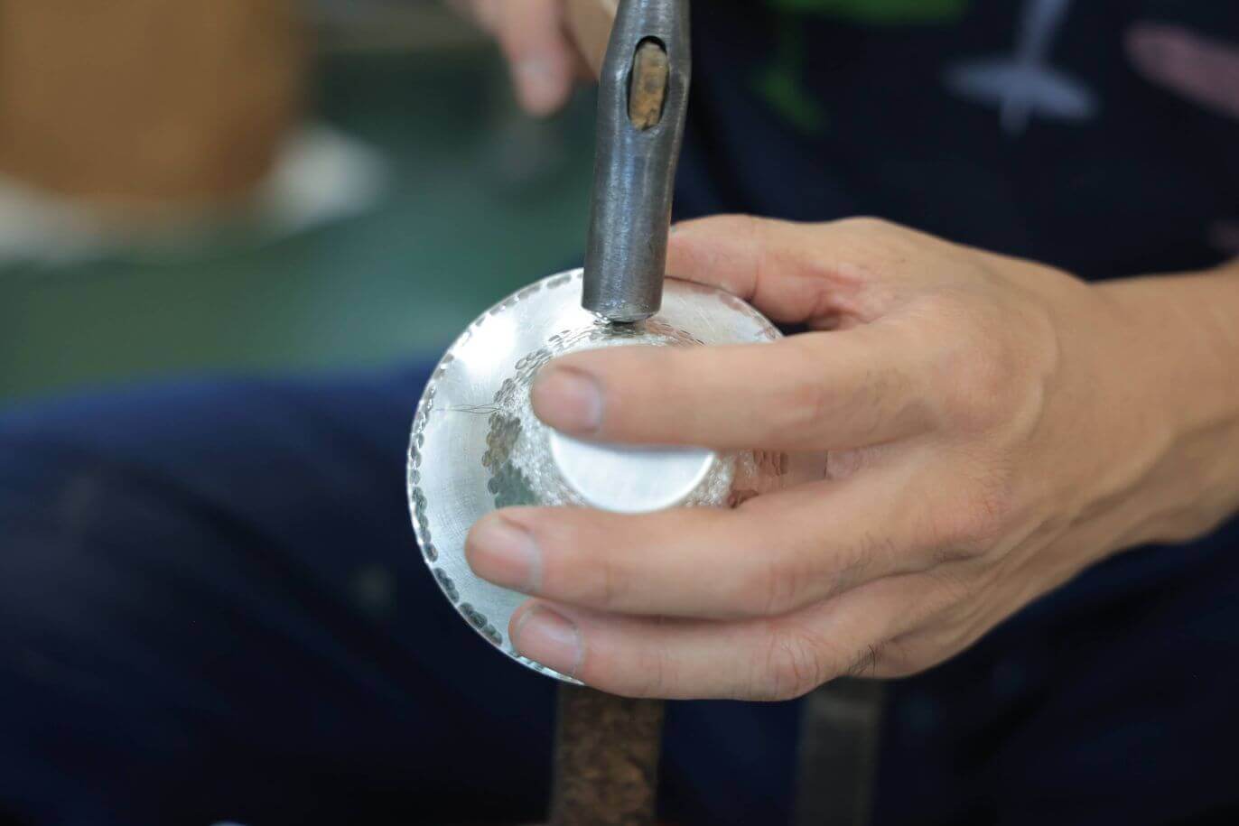 薄く伸ばした銀板を金槌で叩いて形状を整えていく。