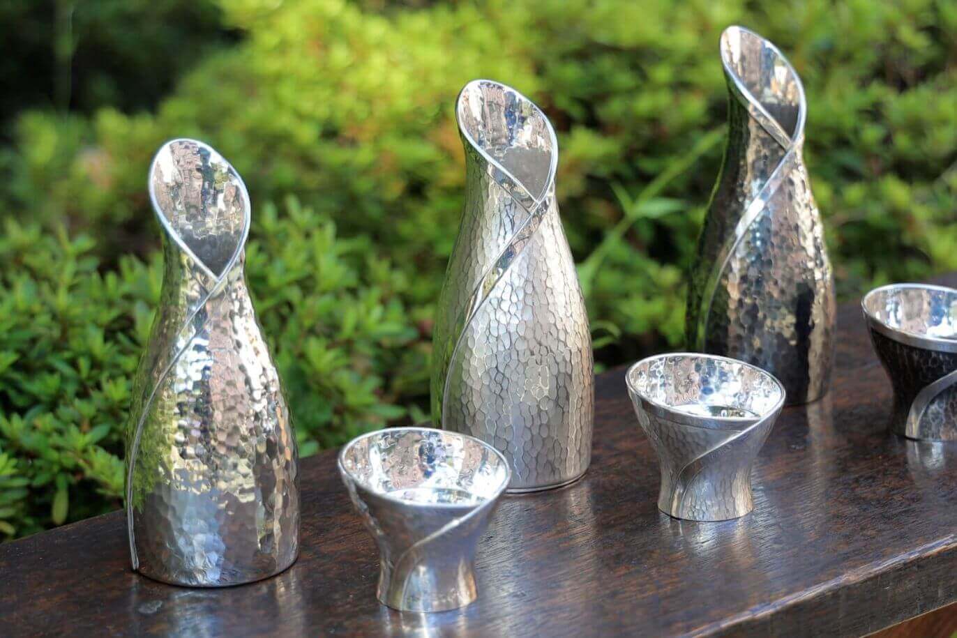 優秀賞を受賞した令和6年度の新作「しんじゅのころも」は、純銀玉盃のぐい呑みと徳利で、酒を注ぐと盃の中に球体が現れる。