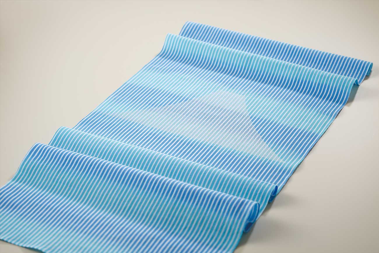 19世紀後半に入ってゆかたは部屋着・寝間着として定着し、現在では縁日や花火大会といった夏の行事で着用されています。現在はプリント染の浴衣が主流ですが、伝統的な染色の工程では、やかんと呼ばれるジョウロ型の容器に染料を入れ、反物に注いで色をつける注染と呼ばれる技法が用いられています。異なる色の染料が入ったやかんを同時に注ぐことで生まれる美しいぼかしは、職人の高度な技術を必要とし、藍色や紺を基調とする主張し過ぎない色合いは"粋"を体現しています。