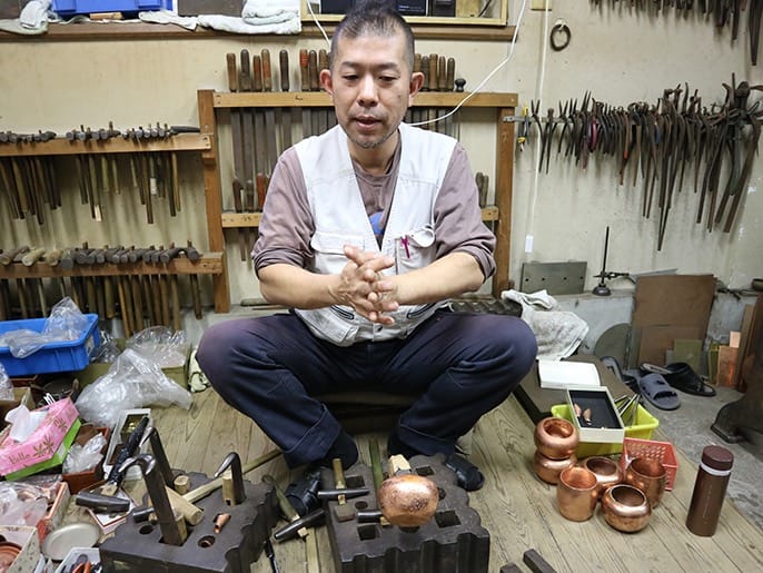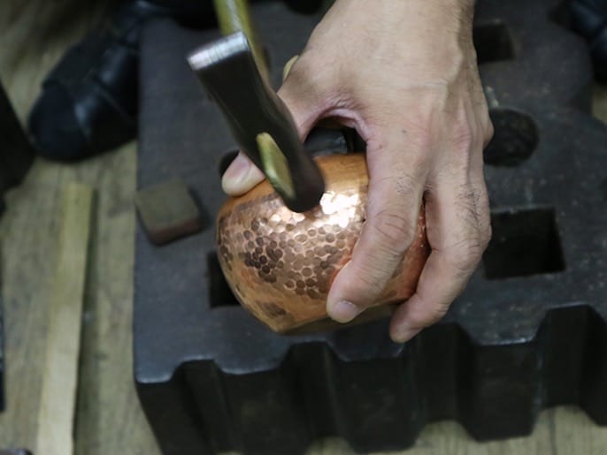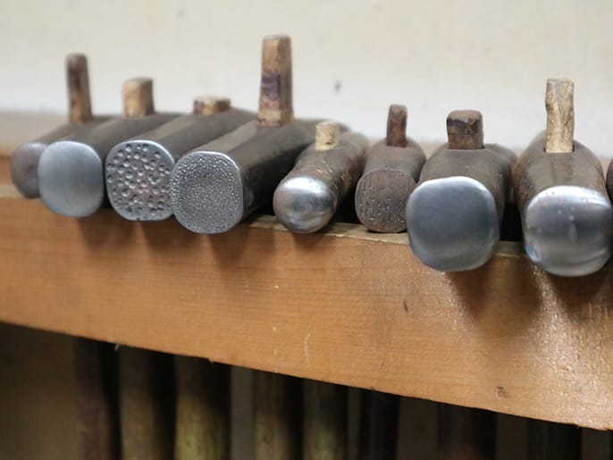 三代続く長澤製作所は、銅、真鍮を主軸に、銀やアルミの加工も行うオールラウンドの鍛金工房だ。工房には金属の板に形を与え、文様を刻んでいく大小の様々な道具がずらりと並ぶ。鈍く光る鎚、焼鈍するためのバーナー、金属の表面を剥くために希硫酸が満たされた水槽。力強く、無骨な道具類だが、これを操る手は繊細だ。長澤製作所の看板商品である、銅製急須。急須そのものの端麗さとともに、その注ぎ口の切れの良さをはじめとした実用性は、名工と称された初代・長澤金治郎さんから当代まで確かに受け継がれている。特に当代の利久さんは、当人が"神経質なくらい"というほど、美しさと機能にこだわりものづくりを行っている。時の移ろいを表現した「古美の色」は、利久さんが苦心の末に辿り着いた表現で多くの人の心をつかんでいる。時に初代がつくった銅製急須が修理に持ち込まれることもある。それほど長く愛着を持って使える名品を、長澤製作所では生み出している。