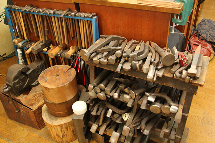 一枚の平らな銀の板が、金切りばさみで正円に切り取られていく。銀製品の加工では、機械を使って型抜きをするところも多いが、日伸貴金属の場合はこの工程から手仕事が始まる。正円に切り抜かれた銀の板は、「絞り」という技術でみるみる形を変えていくが、この工程も"当てがね"と"金鎚"を使い「鎚絞り(つちしぼり)」という手仕事で進められていく。形が決まると、次は研磨の工程。名倉砥石(なぐらといし)という対馬沖で採れる砥石を使います。これら全てが手仕事で、銀盃の口当たりを極上のものに仕上げて行く。銀器の主な工程は、「切る」、「鎚絞り」、「焼鈍(しょうどん)」、「加飾」、「磨き」だが、日伸貴金属では、これを外の職人と分業せずに中だけで行う。それも、当代・上川宗照(そうしょう)さんと三男一女の、銀師(しろがねし)5人家族で行うというのが大変珍しい。日伸貴金属の創業は、宗照さんの父である初代・宗照氏。初代は、江戸末期の名匠・平田禅之丞(ぜんのじょう)氏の直系、平田宗道氏の一番弟子である。名匠の技を二代目が受け継ぎ、そして子たちへ今、受け継がれようとしている。主に長男の宗伯氏が「鎚起」、次男の宗光氏が「へら絞り」、三男の宗達氏が「磨き」、長女の宗智氏が「透かし彫り」という「加飾」に携わる。一家が力を結集し、銀を最高の器に仕立てていく。