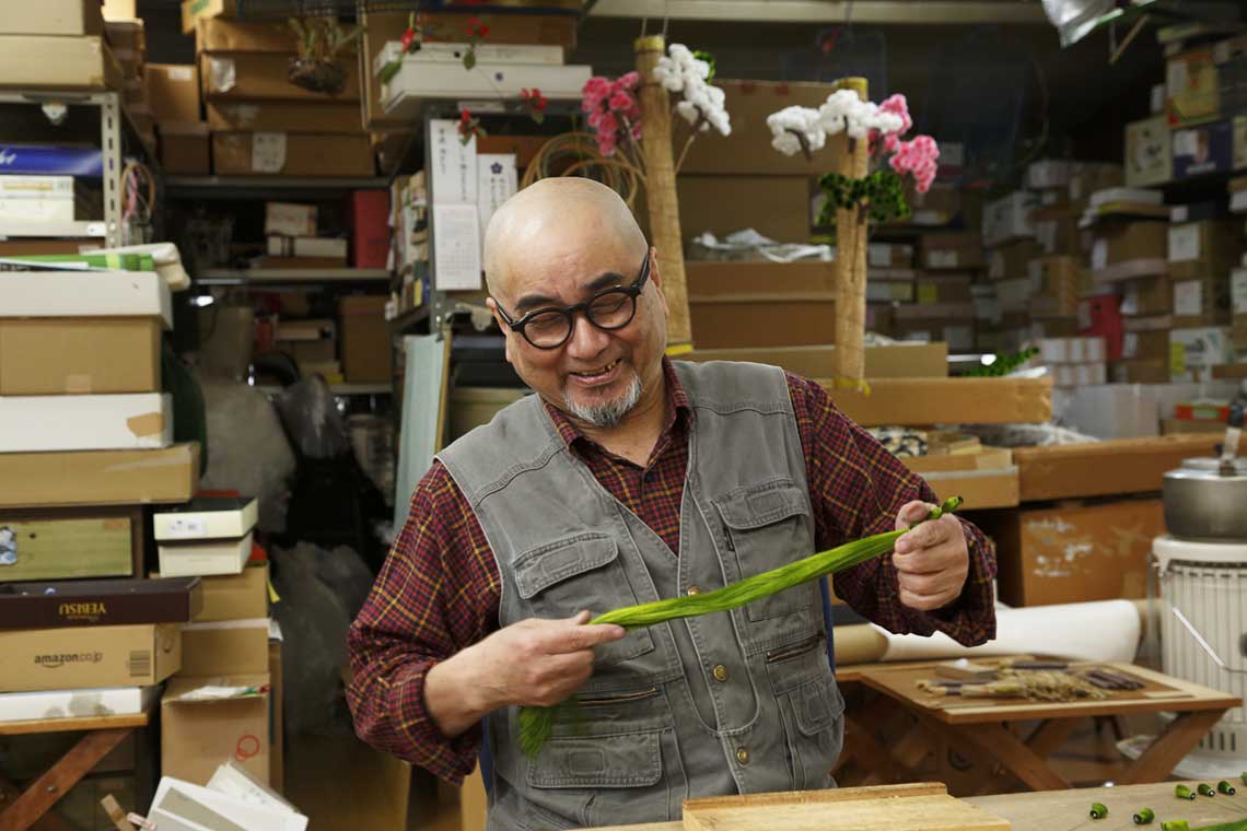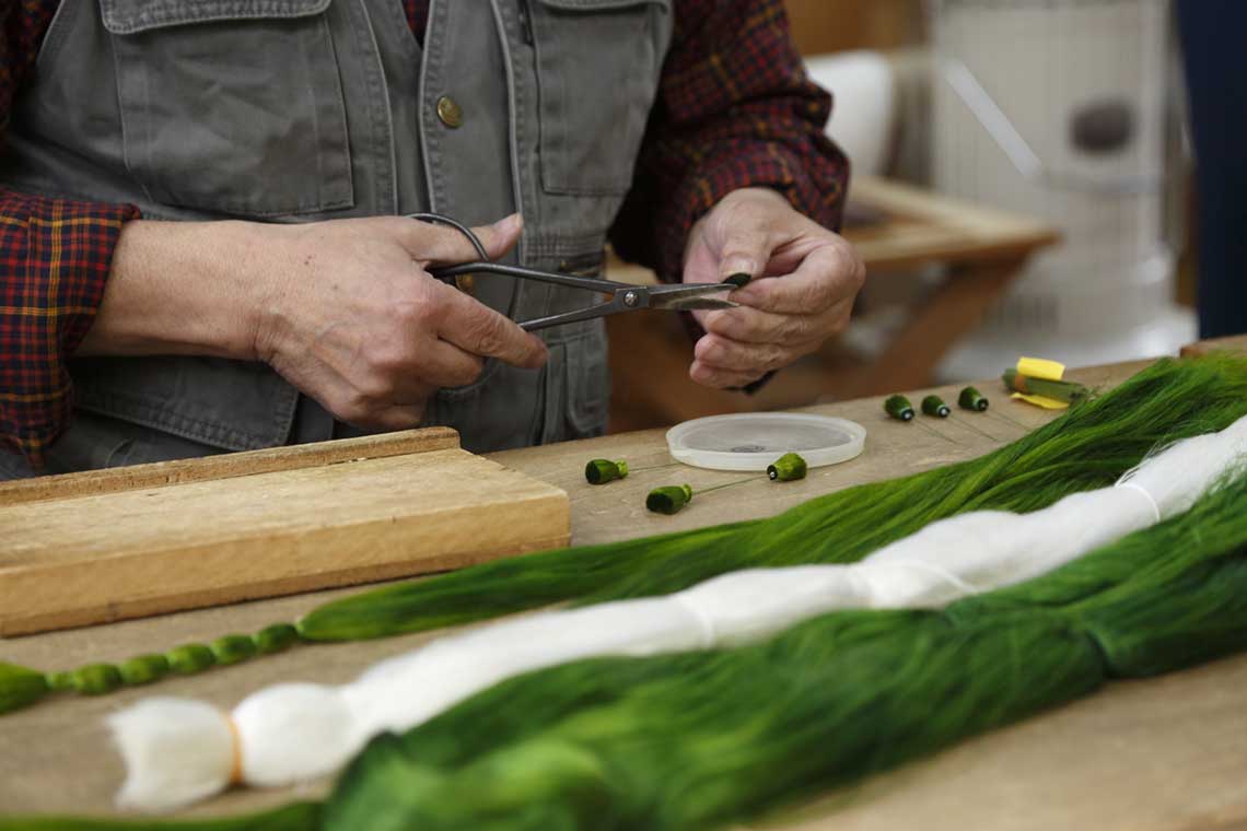 岡田雄二は三代目として日本人形用造花、寺社、祭祀用造花を製作しています。現在は主に雛人形用桜橘、紅白梅、菖蒲を製造し、「和」の伝統を演出する日本の伝統工芸を国内外に発信。作品が仕上がるまでには、パーツ数・延べ工数を気の遠くなるほどの細かい手作業で積み重ねています。