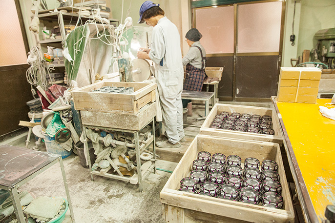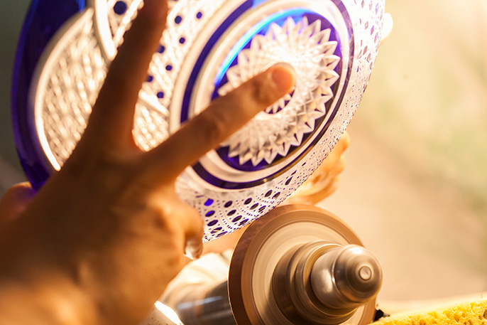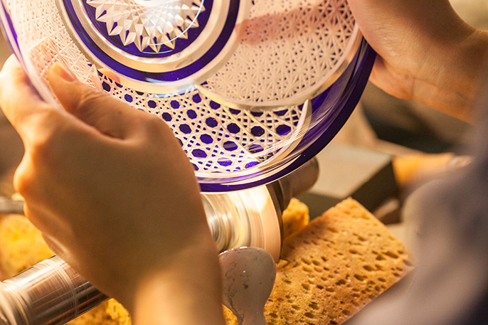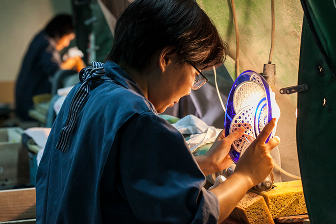 清水硝子は業界でも数少ない、女性社長率いる切子工場だ。切子職人は職人歴60年以上の工場長を筆頭に9名で、生産規模も業界屈指。構成は熟練職人5名、若手職人4名で、若手4名のうち3名が女性という点も珍しい。創業は1923(大正12)年。90年以上の歴史を刻む老舗だが、自社オリジナル商品の歴史は平成に入ってからとまだ浅い。それまでは長年に亘り、高級食器を企画販売するメーカーの下請け加工を専門に行ってきた。品質への厳しい要求に応えるべく、カット研磨技術を磨いてきた清水硝子だが、2009(平成21)年にメーカーがクリスタル事業から撤退したことで大きく方向を転換。自社商品の開発に着手する。高い「技術力」と「生産力」、そして下請け加工で培った「対応力」が清水硝子の大きな強み。強みは広く顧客を集め、今では自社商品だけではなく、披露宴の引出物や記念品などのオーダーメイド製品の生産割合も増加している。東京スカイツリー®のエレベーターの壁面装飾や4Fのオブジェ・チケットカウンターに使われている江戸切子も、清水硝子の手によるもの。食器だけではなく、建材、アクセサリーとフィールドを広げながら、江戸切子を幅広い人々のもとへ届けている。