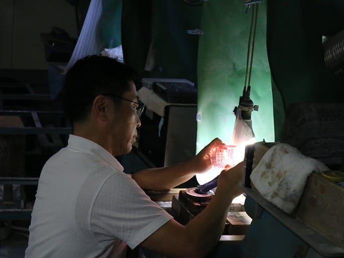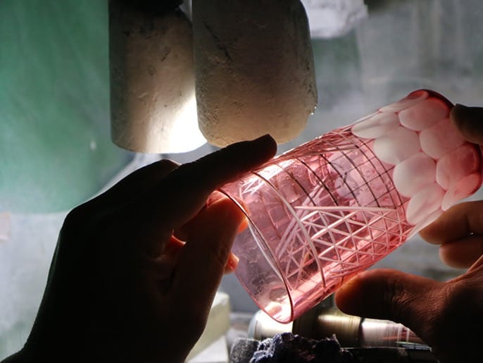 緻密なカットが、「玉」と呼ばれる円状にカットされた面に映り込む。文様が映り込み万華鏡を覗いているような感覚になる。篠崎硝子工芸所は、その技術力と独特のデザインで江戸切子の業界で独自のポジションを築く工房だ。その礎を築いたのは、初代の篠崎清一さんだ。15歳の時に群馬より上京し、清水硝子や他の工房で修行を重ね、様々な技術を習得していった初代。1957(昭和32)年に独立し篠崎硝子工芸所を設立するが、修行の時間は、いずれ自らが"他にないものをつくる"ためのものだったそうだ。そして独立当時から、加工仕事の傍らに自らの作品をつくり独自のデザインを探求してきたという。"他にないものをつくる"という精神は、二代目の英明さんにも受け継がれる。たとえ親子でも、"父の真似に終わらないものづくり"に挑んできた。新作は、毎年生み出される。デザインのアイデアを練ることが、いちばんの苦労だという。現在、工房の職人は5名。その中には三代目となるであろう英明さんの長男、翔太さんの姿もある。