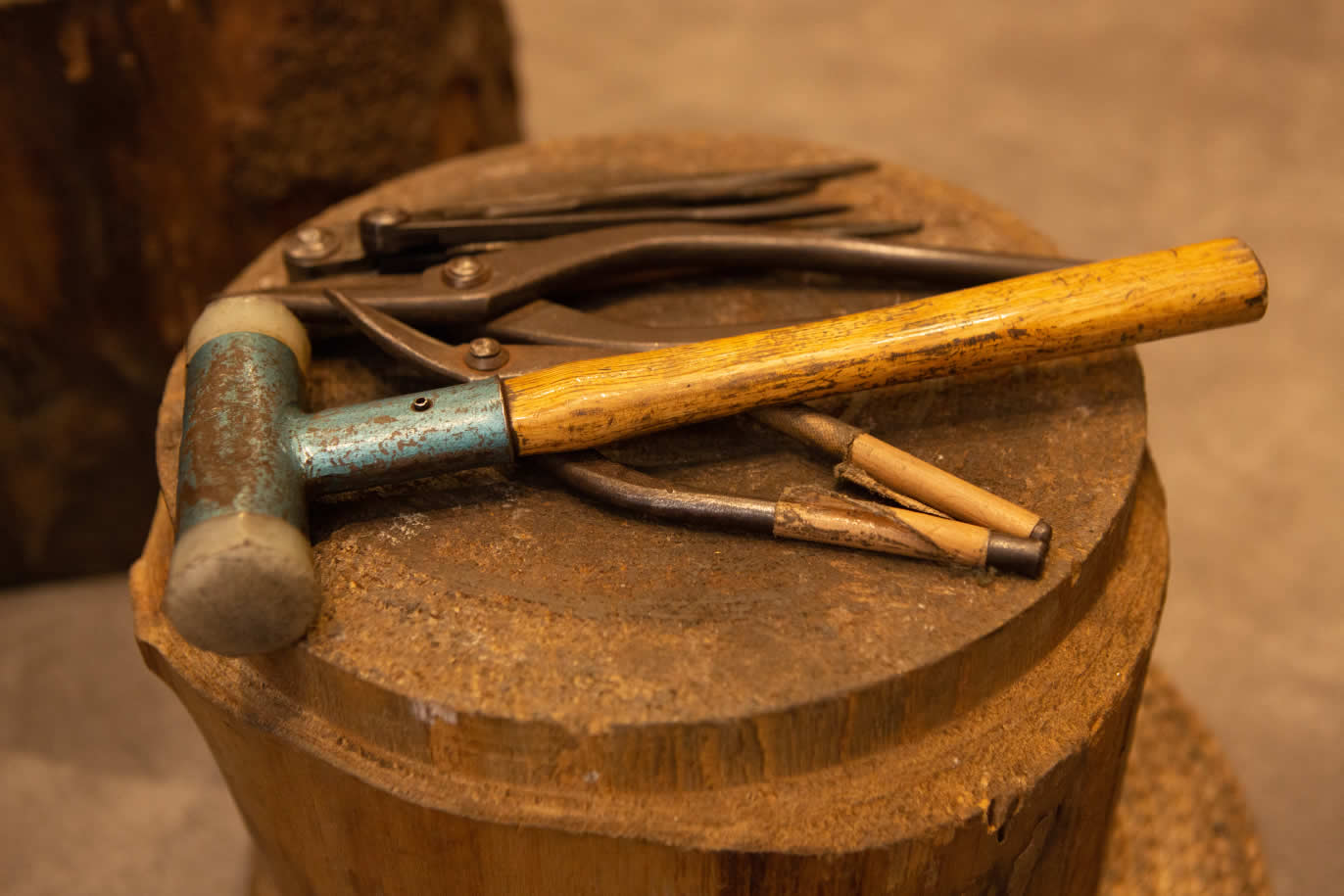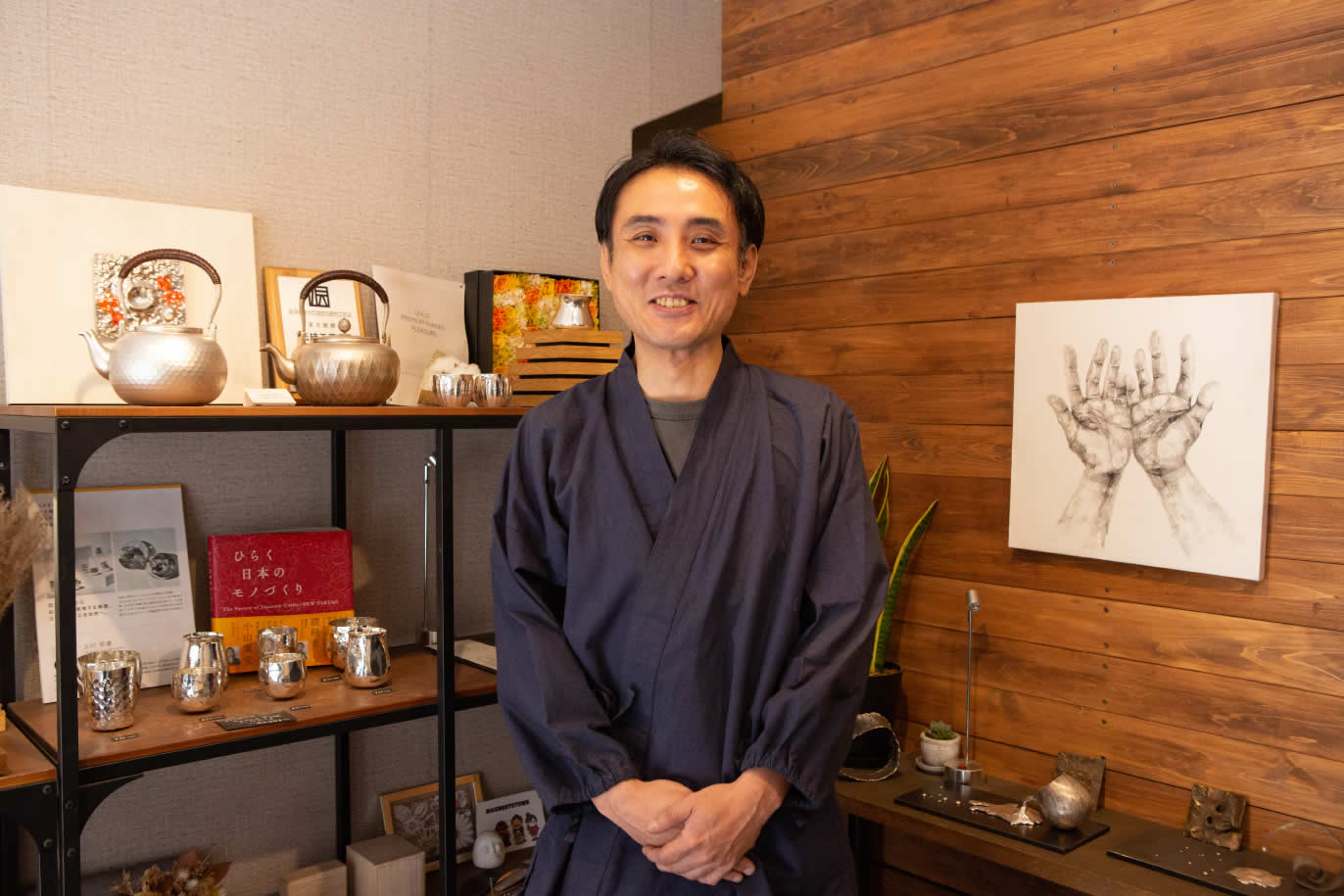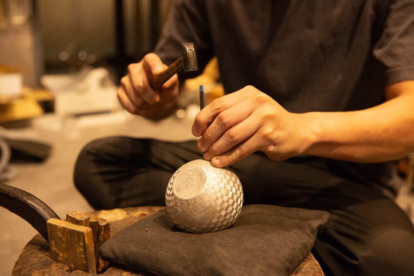 宗達さんは東京銀器の技を継承してきた家に生まれ、2011(平成23)年、30歳のとき当時最年少で東京銀器の伝統工芸士に認定された。2021(令和3)年に宗達アートクラフトを立ち上げる。おもに地金を金槌や木槌で叩き徐々に形を作り上げていく"鍛金"で制作を行っている。