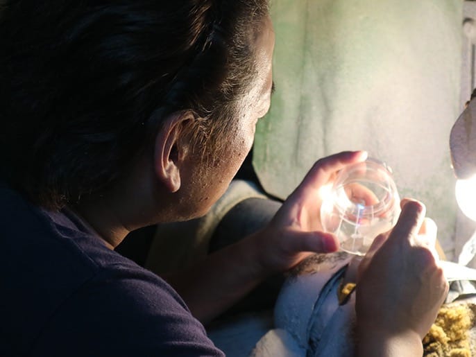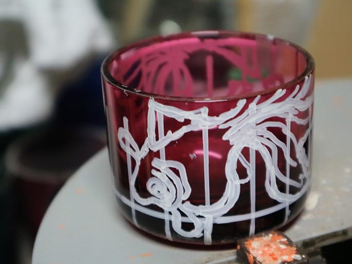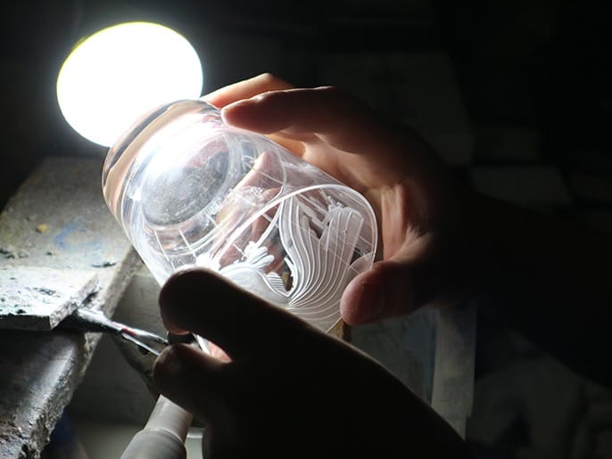 江戸切子の、新しい世界を切り拓く作風。但野硝子加工所の二代目である但野英芳さんの江戸切子には、独特の世界感がある。モチーフは、冬の樹木、金魚、スカル、スパイダーなど景色や生物。これを様々なダイヤモンドホイールを駆使して、絵を描くようにカットしていく。ルネ・ラリックのレリーフを彷彿させるが、透きガラスだけではなく、赤や瑠璃の色硝子を被せたガラスの色を活かしながらカットするところが、ラリック以上に豊かな世界を描き出している。金魚をモチーフにした江戸切子を例にとると、尾ひれの赤い硝子を残すところと削るところをつくることにより、尾ひれに透明感が出て金魚が水の中を泳いでいるような効果を生み出している。但野英芳さんは、設計事務所勤めを経て江戸切子の職人になったという。但野硝子加工所を興した父・孝一さんとともに仕事をしたのは、わずか2年半。その後は、ほぼ独学でカットの技術を身につけた。厳しく孤独の道のりであっただろうが、その時間が独自の作風を生み出したのかもしれない。孝一さんが遺してくれたダイヤモンドホイールをはじめとする多くの道具も、独自の作風を支えている。