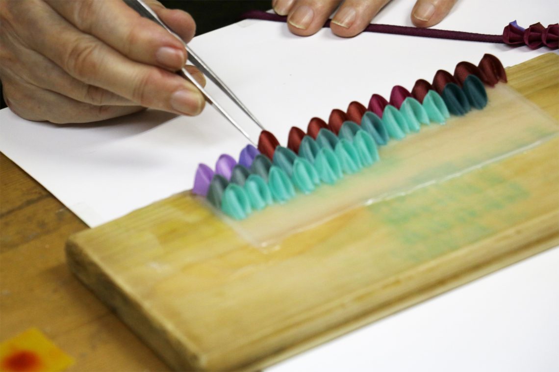 夢工房の穂積実氏は16歳で弟子入りして以来、もう70年近く「つまみかんざし」の世界にいる。「つまみかんざし」は、色とりどりに染めた数センチの絹布をピンセットでつまんで小さな三角を作り、いくつもの三角を組み合わせて花などの飾りにした髪飾り。多くの女性が髪を日本髪に結っていた時代には、そのみどりの黒髪を彩り、そして今では七五三を祝う女の子や成人の日を迎えた若き女性の髪に彩りを添えている。笑顔があふれるシーンで使われる髪飾りに相応しく、穂積氏が独自に考えたのは「福つまみ」というつまみ方。花びらに尖ったところを作らずに、ふんわりと柔らかな印象を作り出す「福つまみ」が、穂積氏の作る「つまみかんざし」にさらに幸福感を与えている。女性を笑顔にしてきた熟練の技で、穂積氏は洋装に合うアクセサリーも手がけている。もっと多くの女性へ、幸福感を届けていくために。
